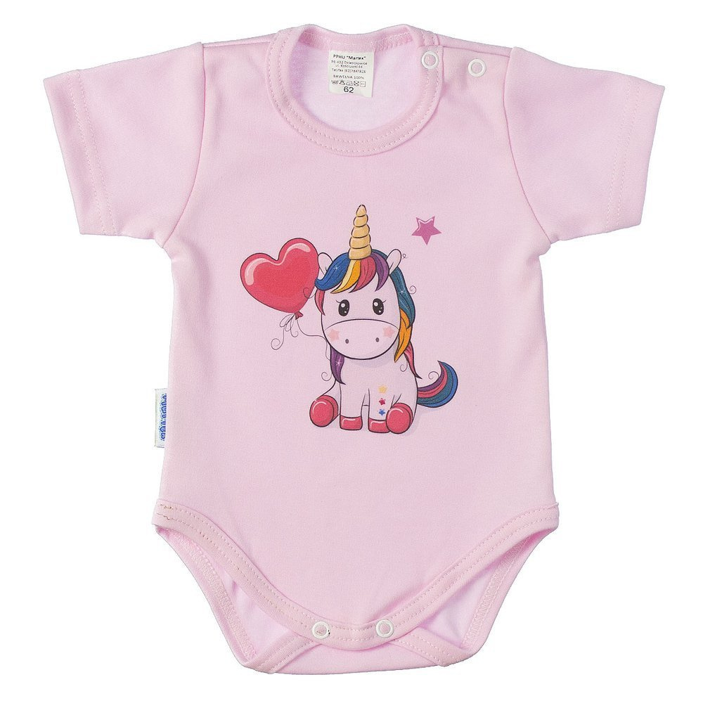 Wygodne body niemowlęce z krótkim rękawem. Z przodu umieszczono nadruk, który wykonano trwałą i bezpieczną metodą farb wodnych. Dla wygody przewijania i ubierania, nasze body rozpinane jest na lewym ramieniu i w kroku. Zatrzaski wykonano z antyalergicznego, bezpiecznego tworzywa bez dodatku niklu. To niezbędny element wyprawki niemowlaka.