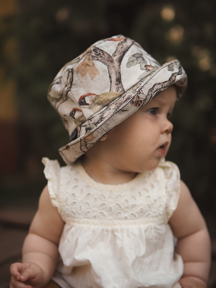 Wygodny, bawełniany kapelusz, który świetnie chroni główkę przed wiatrem i promieniami słońca. W około ma duże rondo, które dodatkowo chroni buźkę, ramiona, oraz kark przed promieniami słonecznymi.