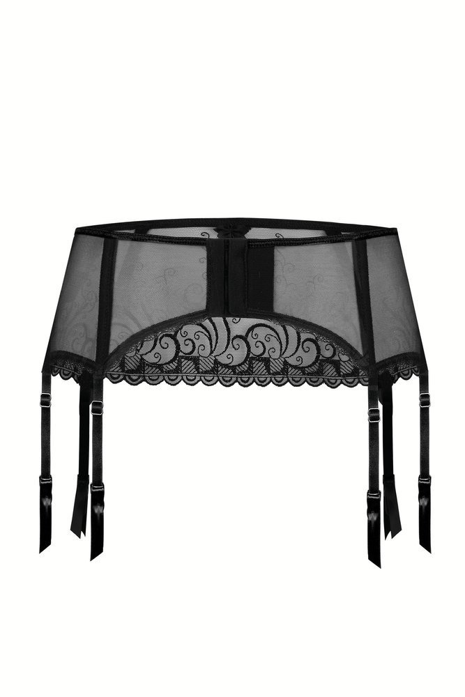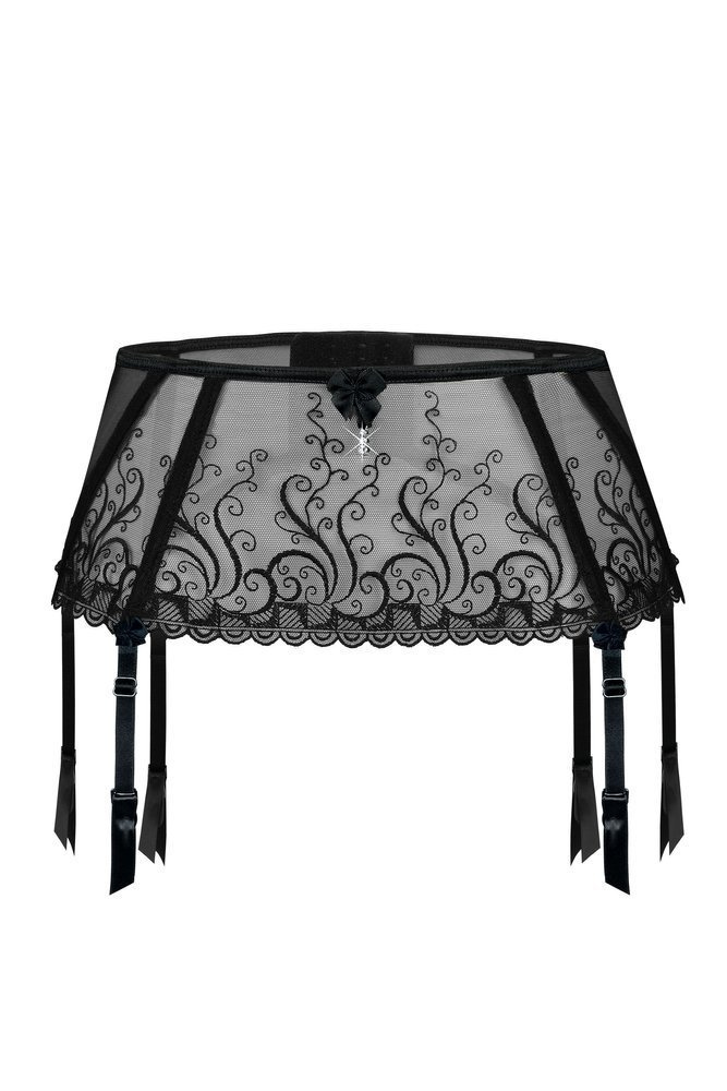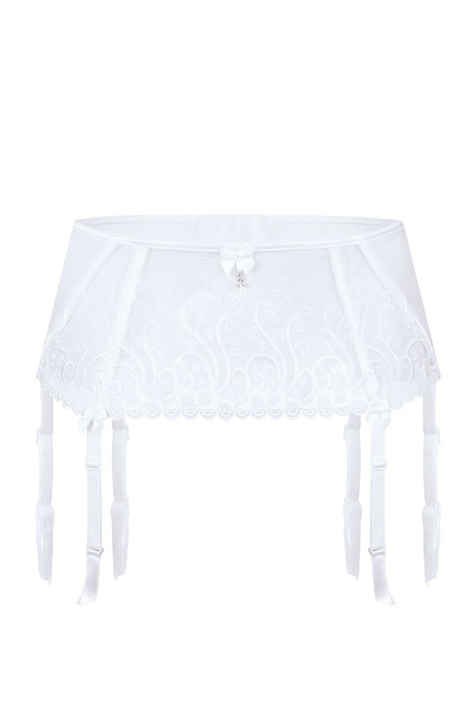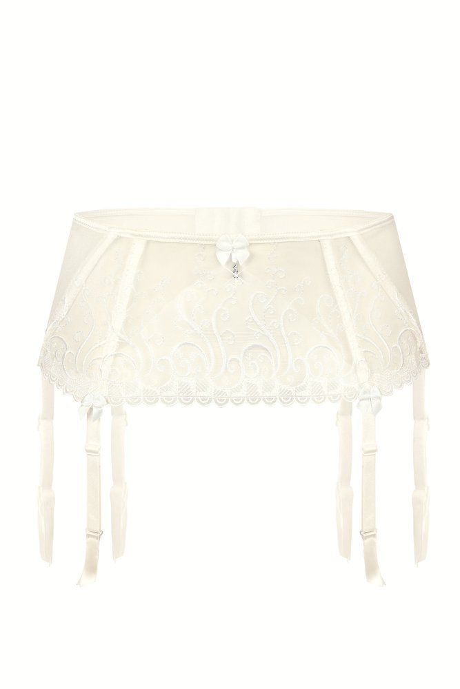 Podkreślający linię bioder pas, wykonany został z haftu i przezroczystego tiuliku.