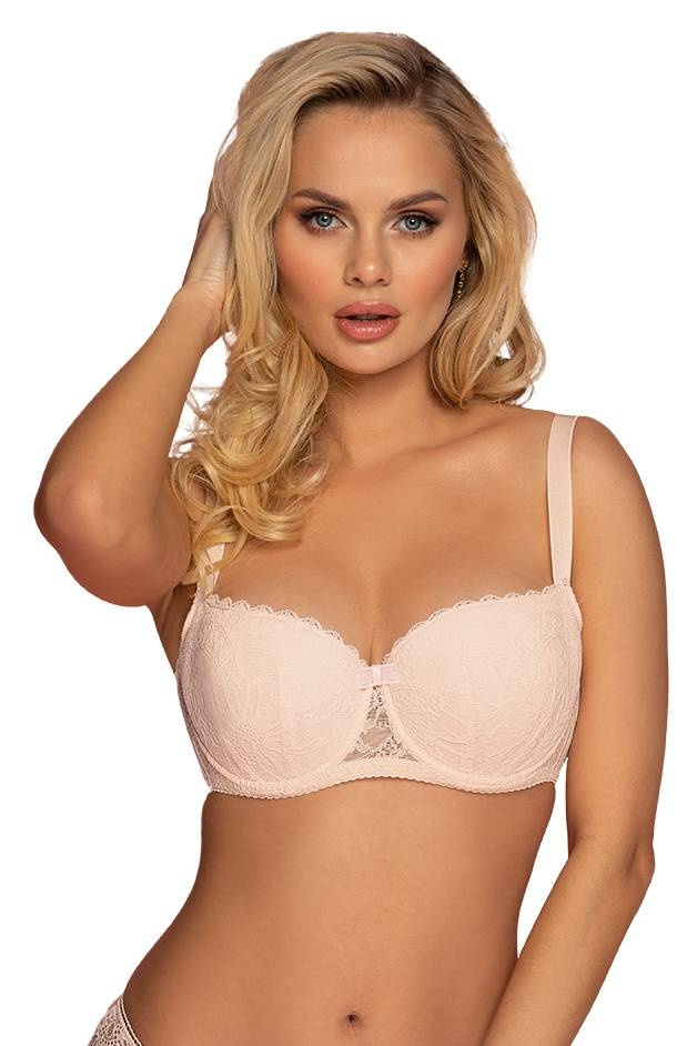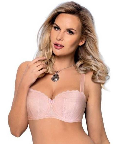 Model uwydatnia biust odkrywając jego górną część. Wykonany jest z delikatnej koronki w kolorze pudrowego różu, zaś tył z przeźroczystego tiulu. Dopełnieniem całości jest kokardka umieszczona na środku.