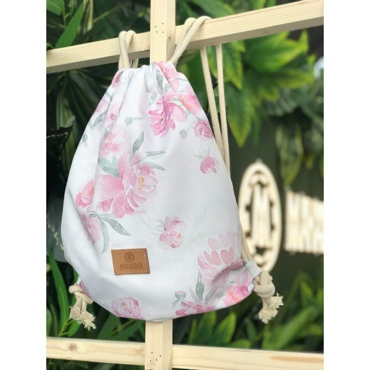 Długie bawełniane sznurki pozwalają stosować worek jako plecak zarówno dla dziecka, jak i dla mamy. Długość sznurka można regulować związując go na końcach, dzięki czemu już przedszkolak może nosić plecak swobodnie.