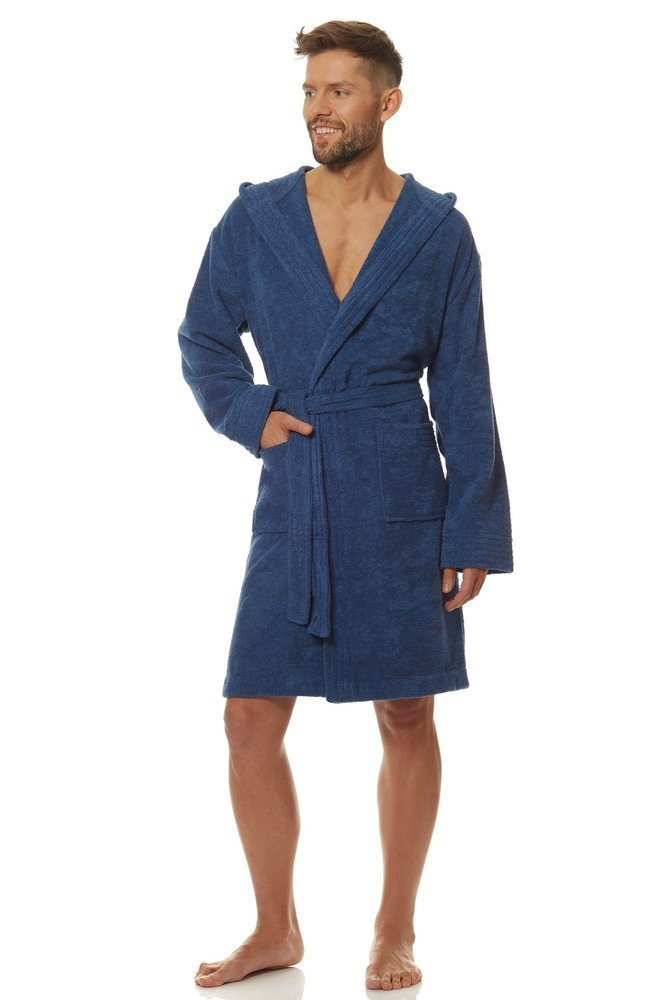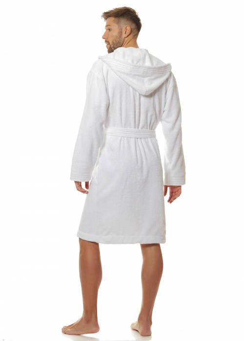 Krótki szlafrok męski z kapturem, wiązany w pasie, z miękkiej dzianiny frotte. Na biodrach kieszenie zewnętrzne.