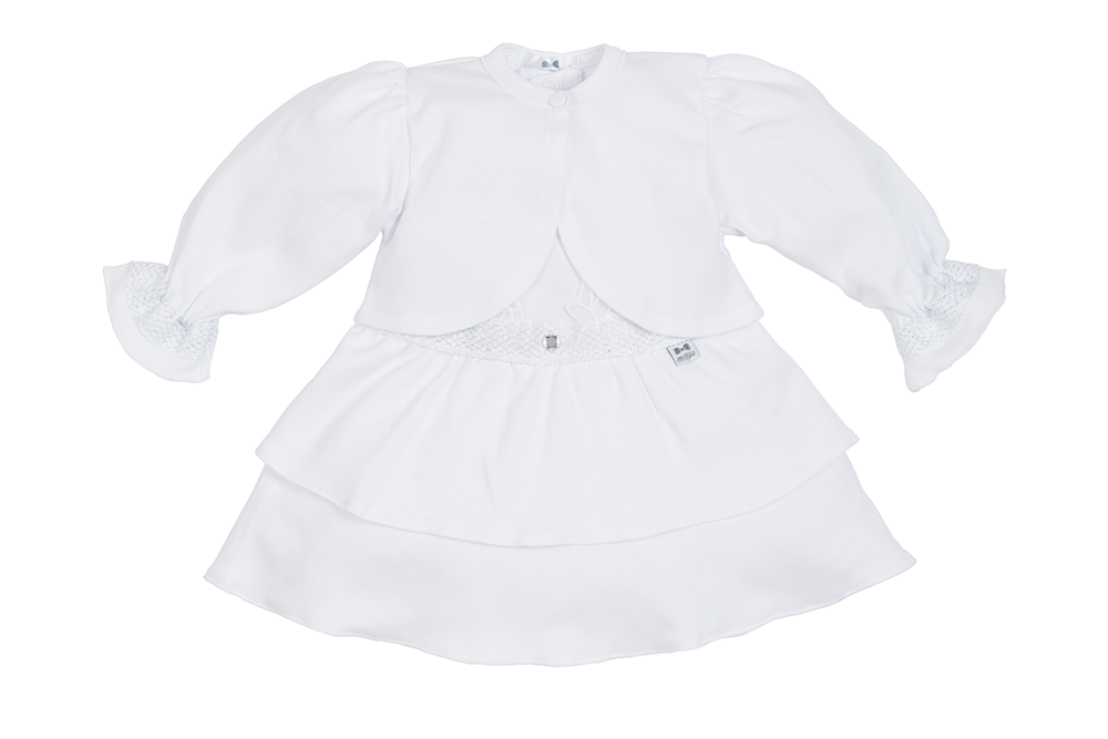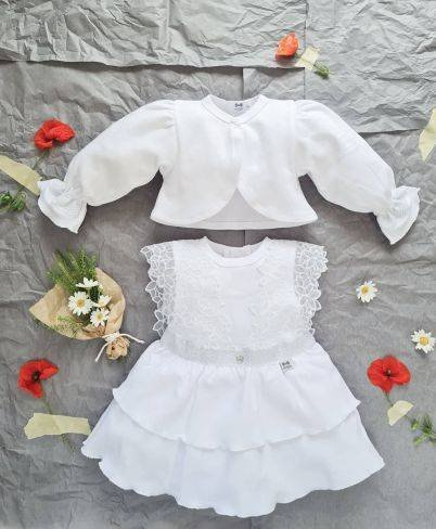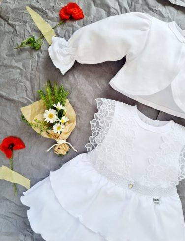 Zapytaj o produktPiękna wizytowa sukienka i bolerko z kolekcji Diva. W zestawie sukienka wykończona piękną koronką oraz paskiem z delikatnymi cekinami oraz kryształkiem oraz białe bolerko na jedną napkę z bufiastymi rękawkami, które zdobione są cekinową tasiemką. Model ten został stworzony z myślą o wyjątkowych okazjach.