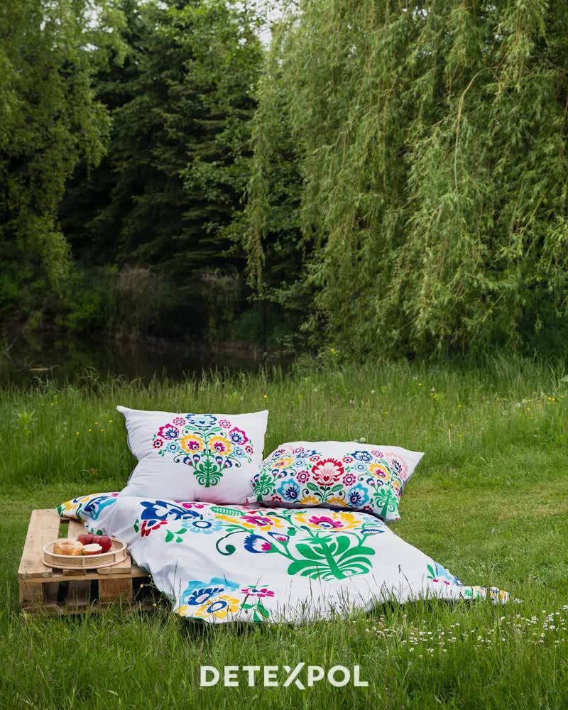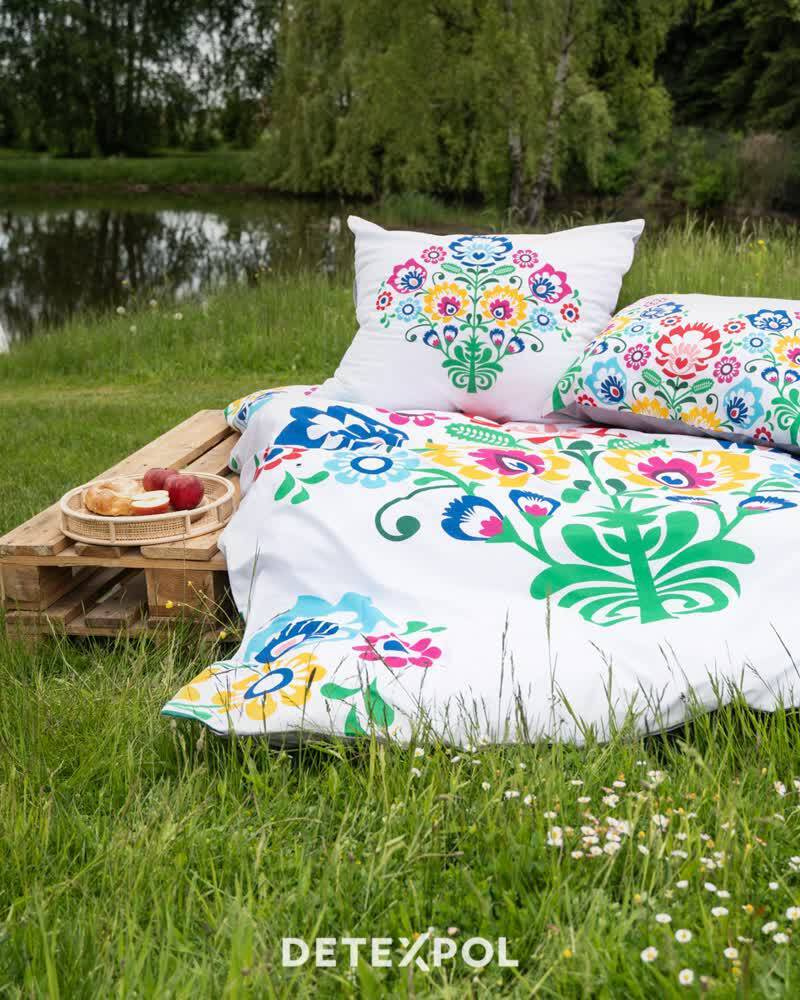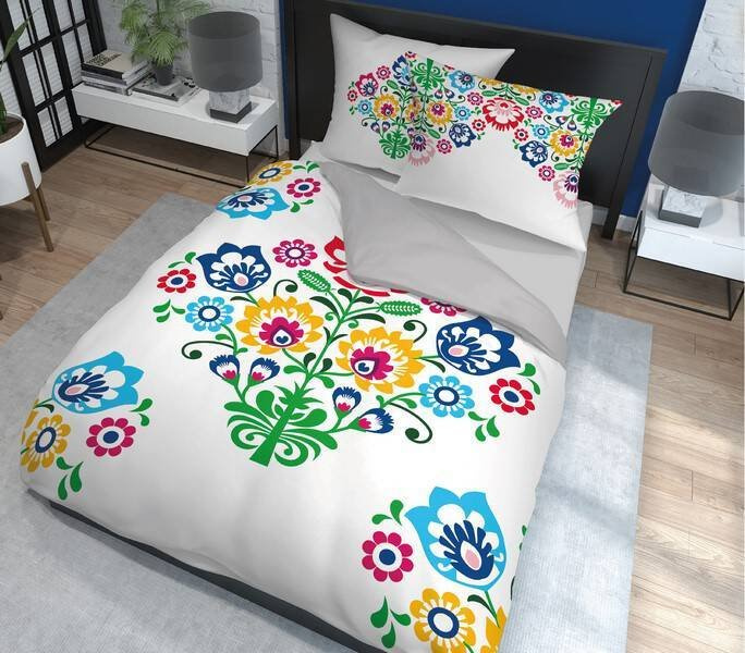 3612 A Pościel bawełniana Łowicka wycinanka kwiaty kurpiowska Detexpol biały/szary
