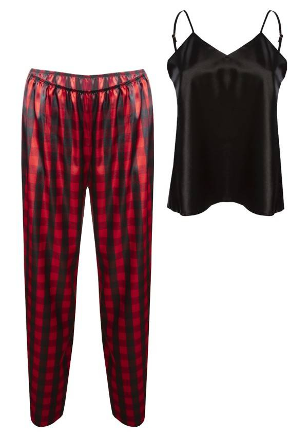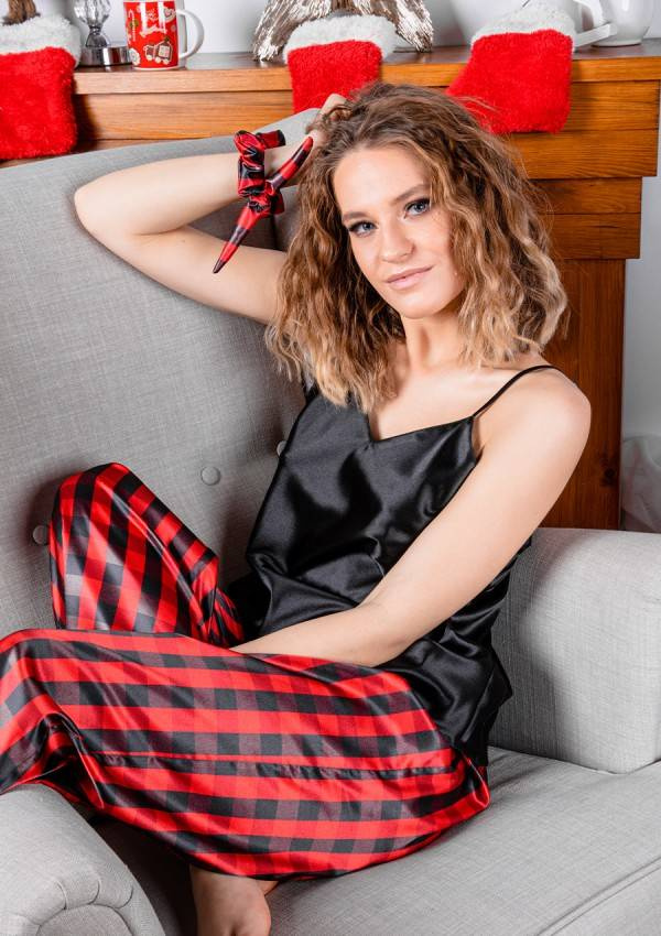 Prosty, zmysłowy dwuczęściowy komplet składający się z koszulki oraz długich spodni. Odważny dekolt w kształcie litery „V”, który jest niezwykle kuszący. Góra koszulki wykonana z drukowanej wzorzystej satyny. Wąskie ramiączka z regulacją zapewnią Tobie poczucie komfortu podczas snu. Spodnie proste, długie satynowe na cienkiej gumce dodające elegancji.