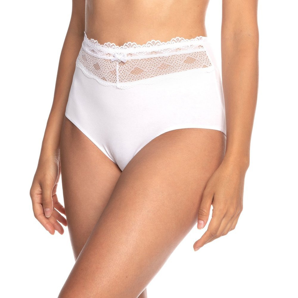 Efektowne figi wykonane z miękkiej bawełny, z wysoką linią talii oraz zabudowane na biodrach. W górnej linii pasa ażurowa koronka i satynowa kokardka z zawieszką.