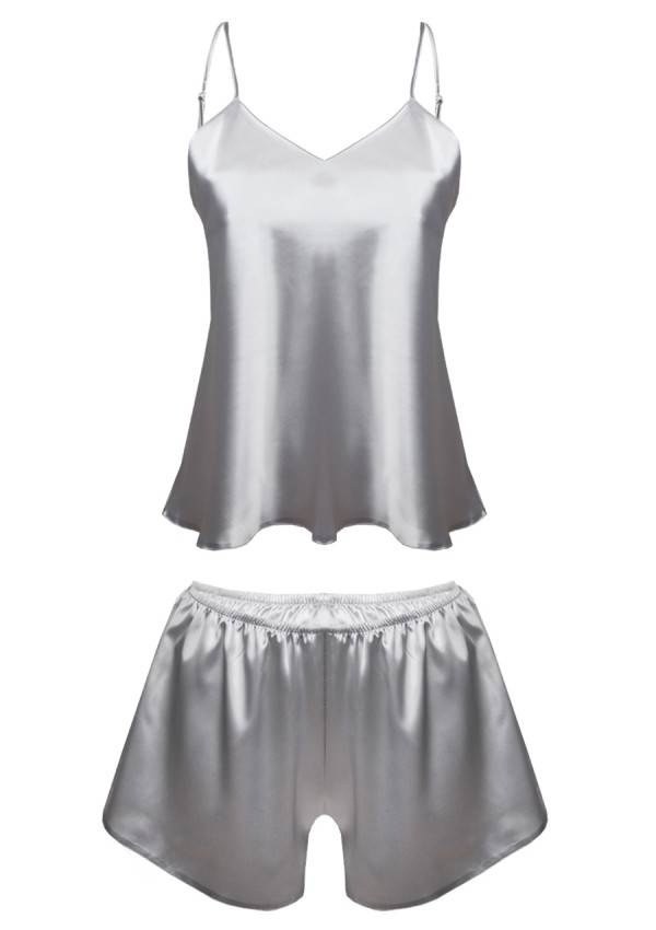 Satynowy komplet Karen firmy DKaren. Składa się z koszulki i spodenek. Przód koszulki tworzy delikatny, trójkątny dekolt. Spodenki na cienkiej gumce, bardzo wygodne w noszeniu.