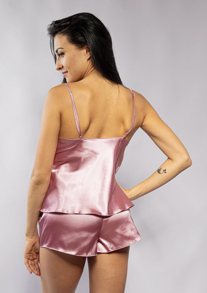 Satynowy komplet Karen firmy DKaren. Składa się z koszulki i spodenek. Przód koszulki tworzy delikatny, trójkątny dekolt. Spodenki na cienkiej gumce, bardzo wygodne w noszeniu.