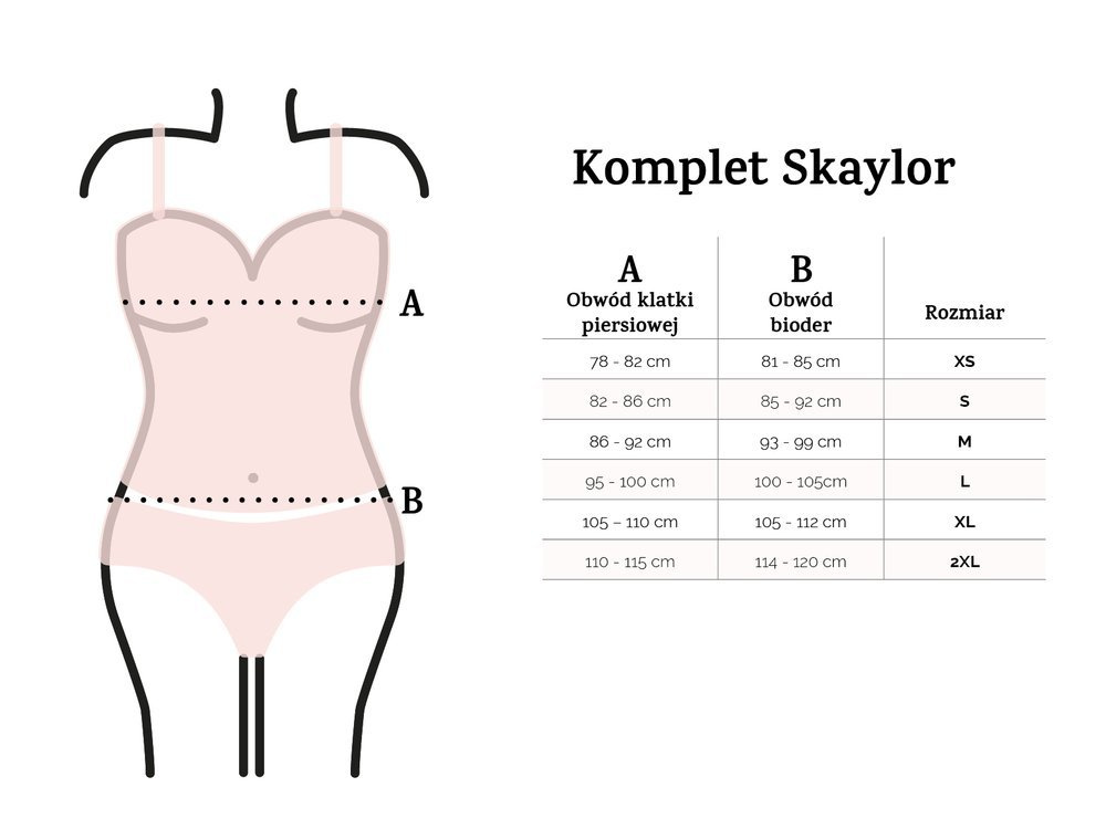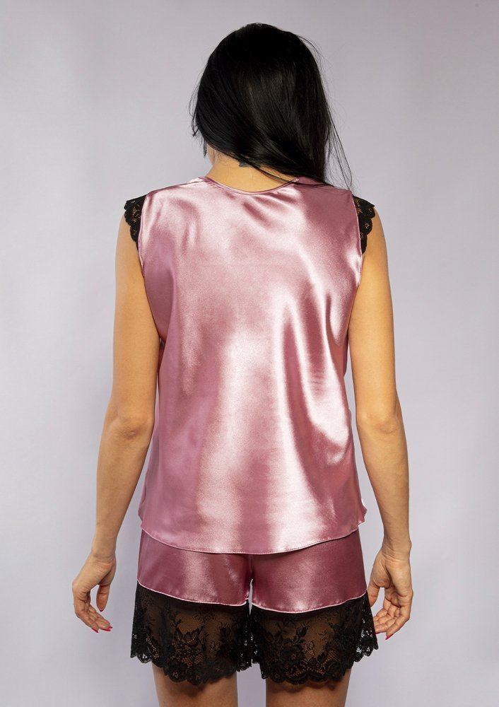 Ta piżama satynowa damska składa się z koszulki oraz krótkich spodenek z elastyczną gumką w pasie. Top posiada szerokie naramki. Obydwie są obszyte malutkim koronkowym materiałem w kolorze ciemnogranatowym. To sprawia, że koszulka zyskuje krótki rękaw. Ta sama kwiecista koronka jest również wszyta przy dekolcie oraz na zakończeniu nogawek. Na środku biustu oraz na górze spodenek przyszyta jest urocza, mała kokardka. Komplet Skaylor wykonany jest z delikatnego materiału satynowego.