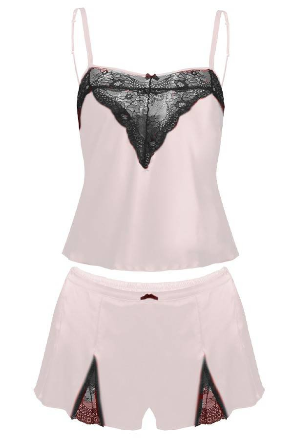 Satynowy komplecik w który skład wchodzi koszulka oraz spodenki. Górę koszulki zdobi delikatna, zmysłowa koronka na dekolcie.