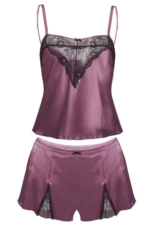 Satynowy komplecik w który skład wchodzi koszulka oraz spodenki. Górę koszulki zdobi delikatna, zmysłowa koronka na dekolcie.