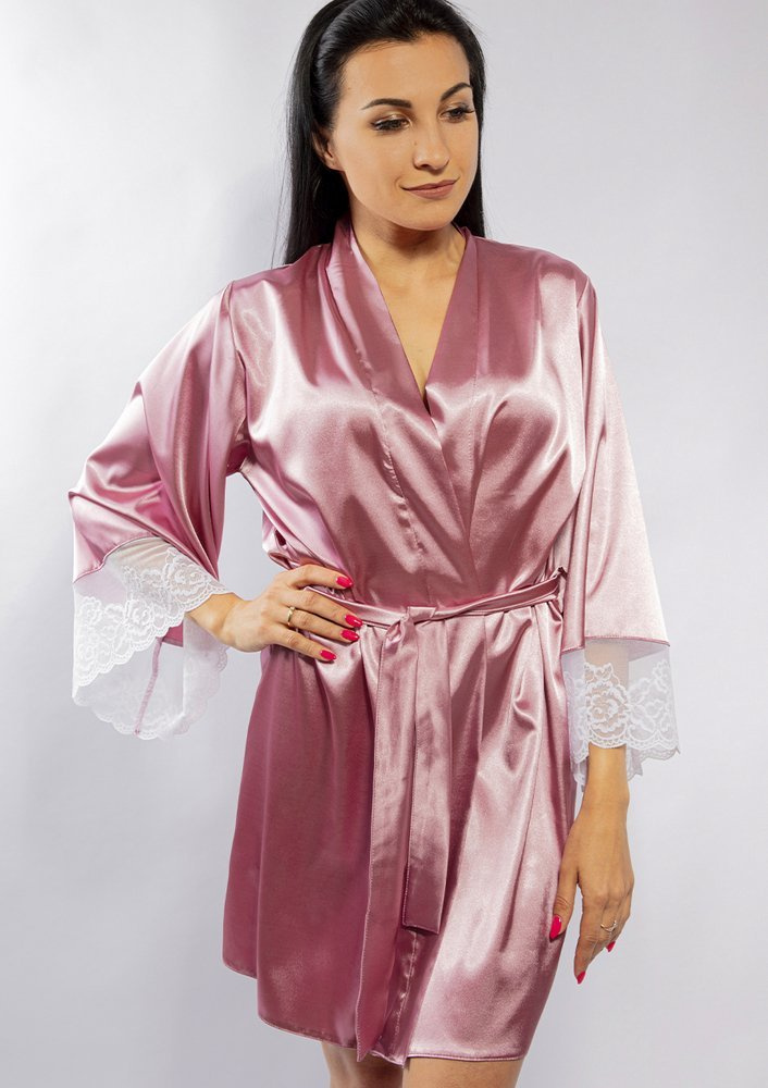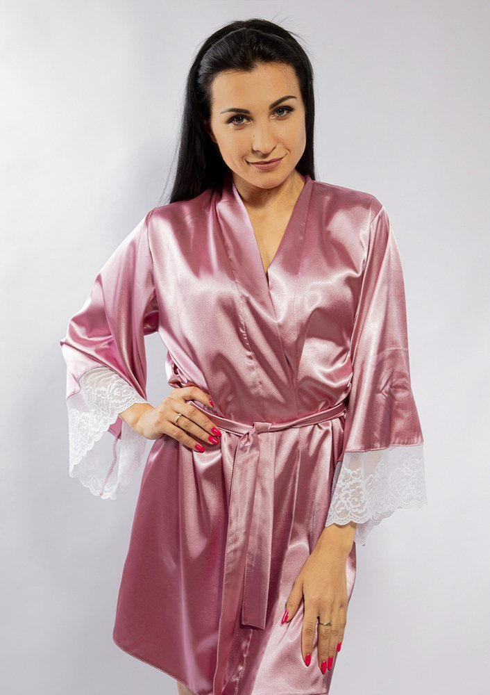 Przyjemny satynowy szlafrok dla każdej kobiety. Długie rękawy wykończone piękną koronką . Przeplatany paskiem satynowym, który idealnie dopasowuje się do sylwetki, uwydatniając atuty kobiecego ciała.