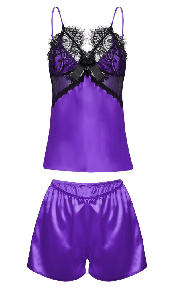 Uwodzicielski komplecik satynowy składający się z dwóch części. Góra koszulki jest uszyta z przepięknej koronki. Miseczki są podszyte satyną która kryje kobiece atuty. Dół i tył koszulki wykończony satyną. Spodenki uszyte z delikatnej satyny. Ramiączka cienkie regulowane.