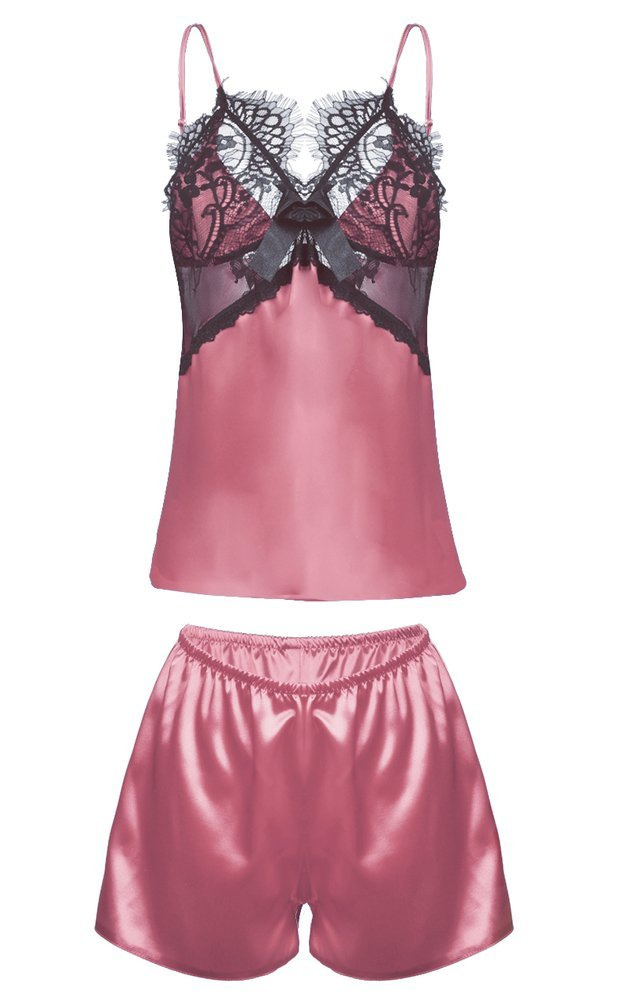 Uwodzicielski komplecik satynowy składający się z dwóch części. Góra koszulki jest uszyta z przepięknej koronki. Miseczki są podszyte satyną która kryje kobiece atuty. Dół i tył koszulki wykończony satyną. Spodenki uszyte z delikatnej satyny. Ramiączka cienkie regulowane.