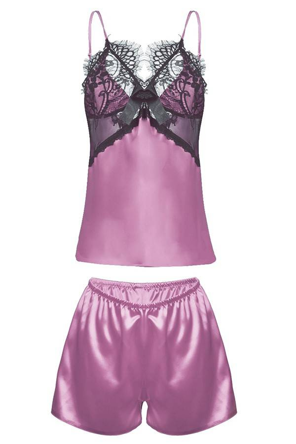 Uwodzicielski komplecik satynowy składający się z dwóch części. Góra koszulki jest uszyta z przepięknej koronki. Miseczki są podszyte satyną która kryje kobiece atuty. Dół i tył koszulki wykończony satyną. Spodenki uszyte z delikatnej satyny. Ramiączka cienkie regulowane.