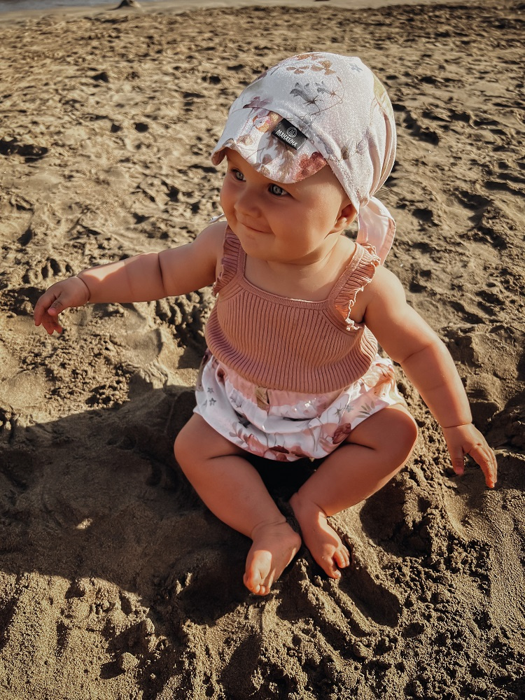 Chusteczka posiada daszek, który dodatkowo chroni przed słońcem buźkę Maluszka. Daszek można wywinąć, lub zostawić na płasko.