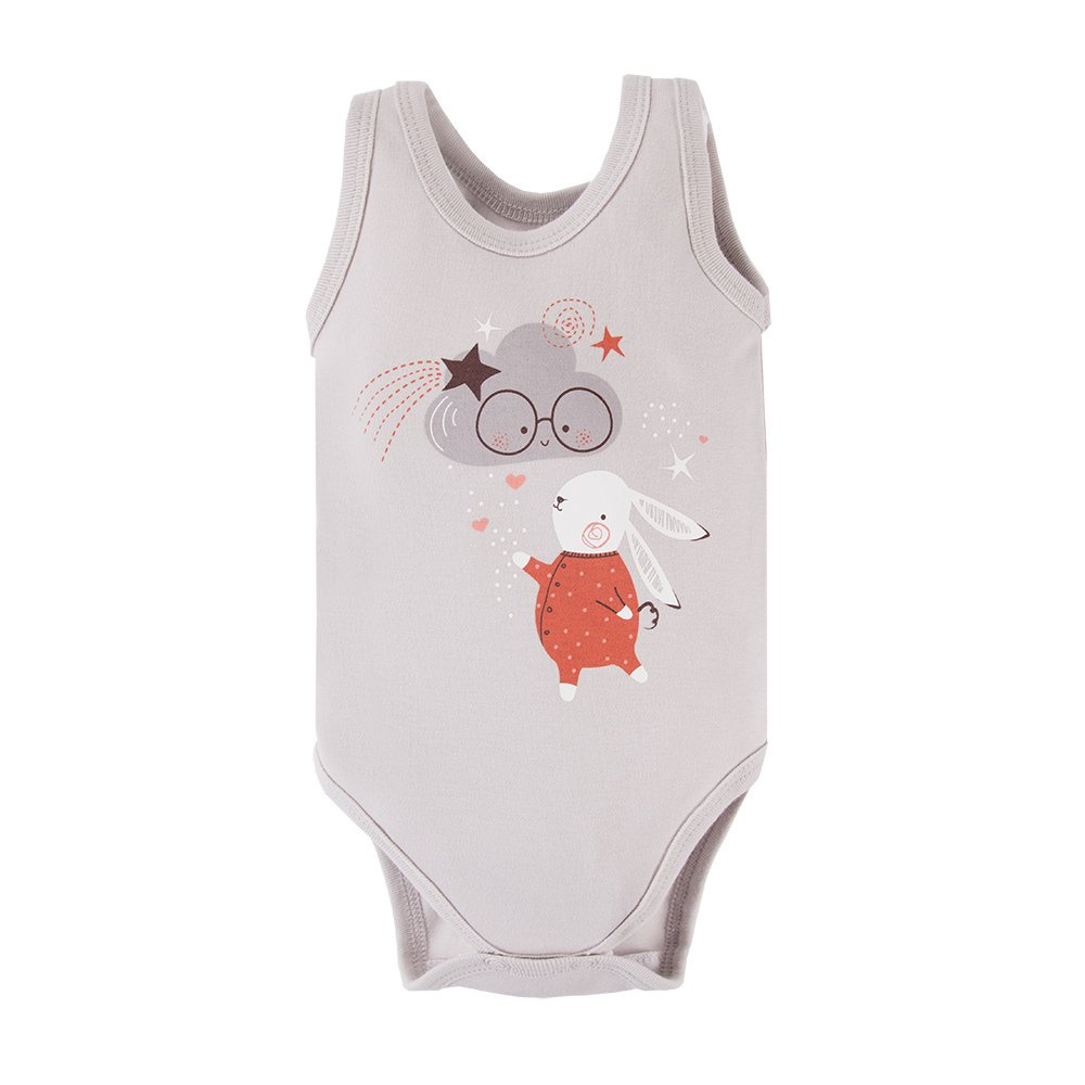 Body ramiączko niemowlęce uszyte z miękkiej i przyjemnej w dotyku drukowanej dzianiny bawełnianej.