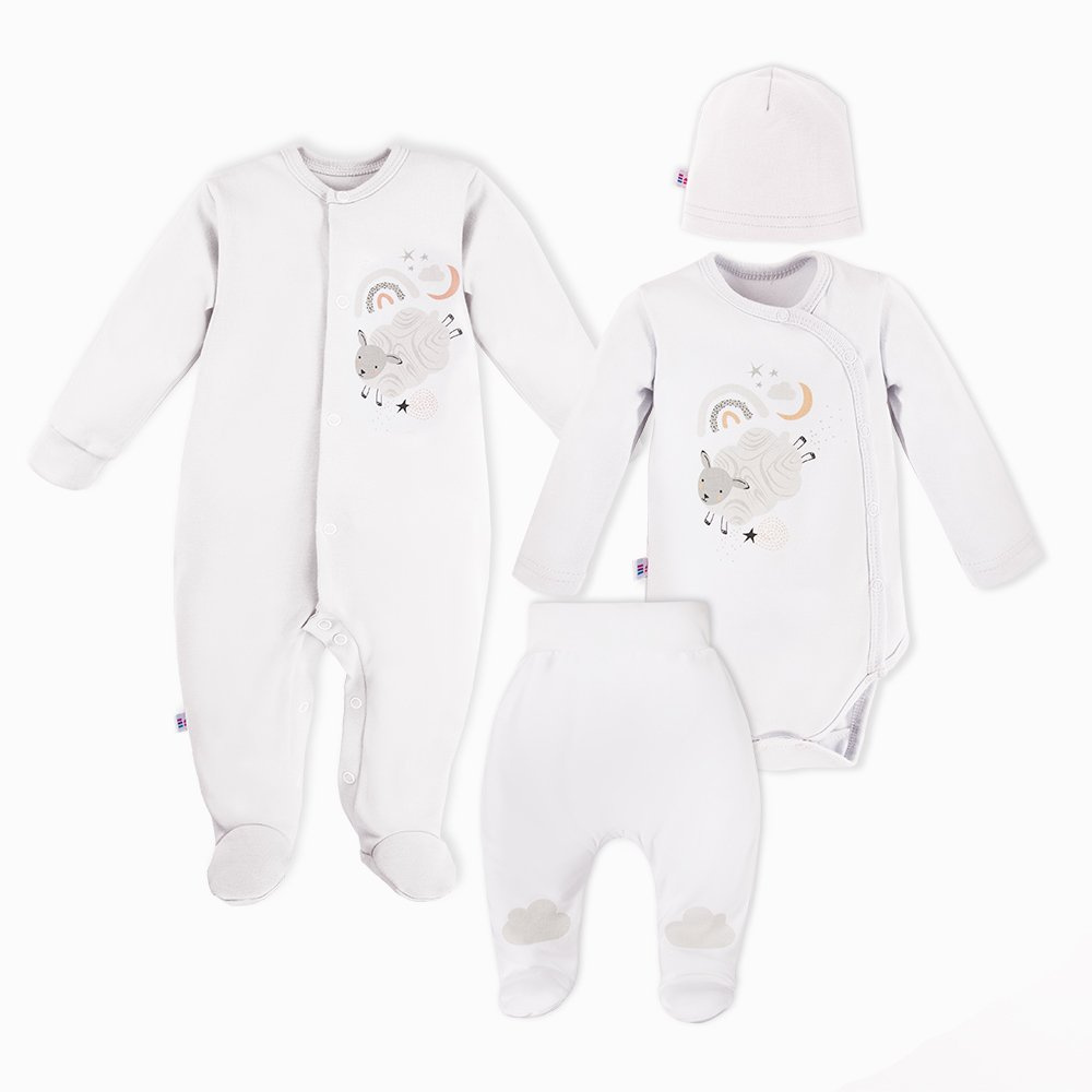 Komplet niemowlęcy uszyty z miękkiej i przyjemnej w dotyku bawełnianej dzianiny. Krój umożliwia całkowite rozpięcie, przez co ubranko jest funkcjonalne i wygodne. Śpioch ozdobiony jest uroczym nadrukiem. Komplety niemowlęce idealnie sprawdzają się w pierwszych miesiącach życia dziecka i tworzą idealny zestaw wyjściowy.