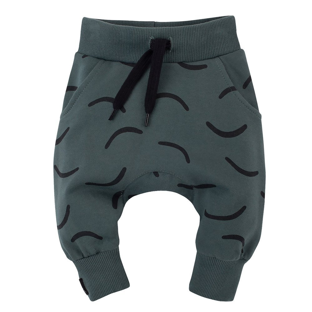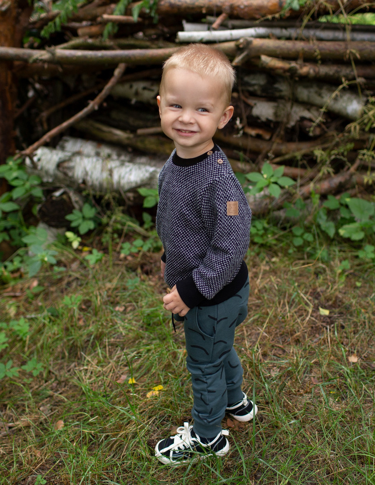 Odpowiedni krój gwarantuje swobodę ruchu, a szerokie ściągacze w pasie i przy kostkach zapewniają komfort i stabilizację na ciele dziecka.
