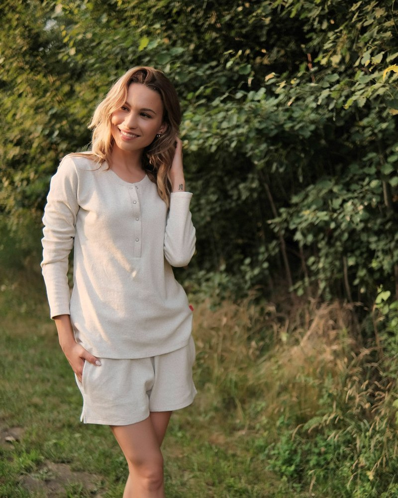 Wygodne spodnie damskie do spania, z wysokiej jakości bawełny i włókna konopnego. Idealne na dobry sen i na wspaniały początek dnia przy pierwszej porannej kawie. Spodnie krótkie, w pasie wykończone gumką. Przyjemne w dotyku, utrzymane w ciekawej kolorystyce.