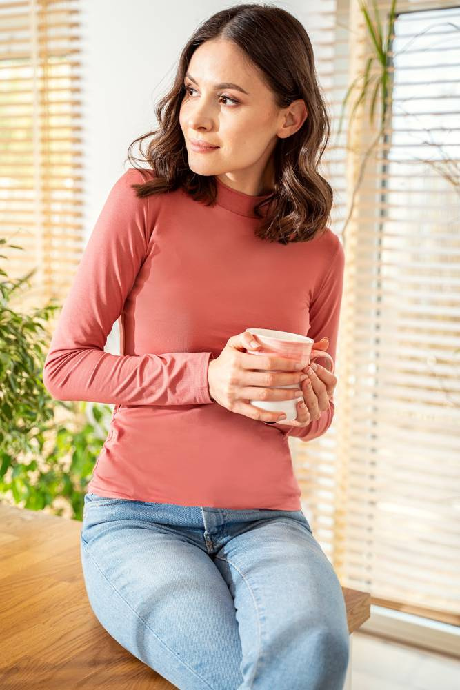 Koszulka damska wykonana z miękkiej wiskozy z dodatkiem elastanu. Półgolf, długi rękaw. Dopasowuje się do ciała zapewniając komfort noszenia. Cała koszulka jest gładka, dzięki czemu można ją wykorzystać pod kolorowe i wzorzyste marynarki.Powyższy produkt jest wyrobem najwyższej jakości, został zaprojektowany według najnowszych trendów mody. Wiskoza jest materiałem który idealnie dopasowywuje się do ciała,ale również jest materiałem przewiewnym i przyjaznym dla skóry. Włókna wiskozowe, gwarantują wyrobom dobrą układalność, są oddychające i przyjemne w dotyku. Mówi się o nich, że łączą w sobie walory estetyczne jedwabiu z łatwością pielęgnacji bawełny.