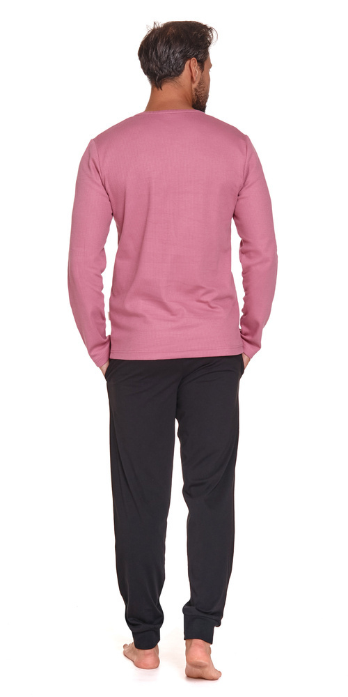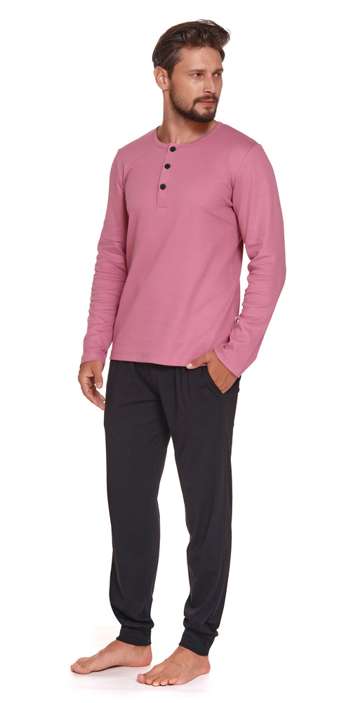 Piżama męska wykonana z wysokiej jakości miłej i miękkiej bawełny. Model o klasycznym kroju. Koszulka z długim rękawem, dekolt półokrągły, z guzikami. Spodnie długie, gładkie, wykończone komfortową gumką w pasie. Nogawki zakończone ściągaczami. Spodoba się najbardziej wymagającym mężczyzną.