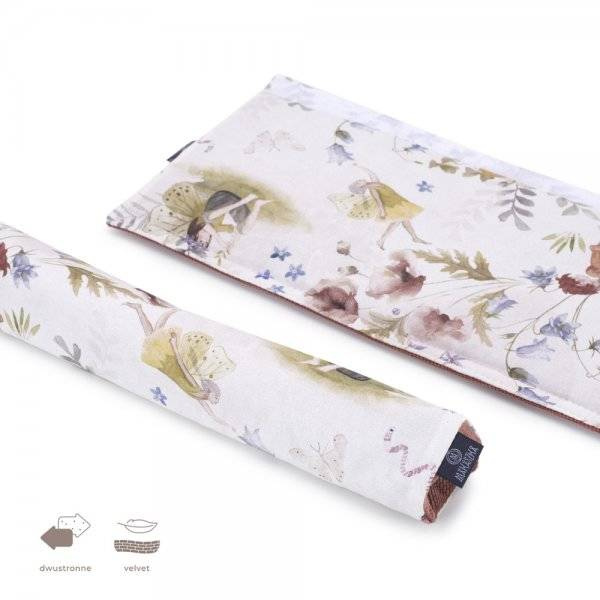 Wykonany z jednej strony z najwyższej jakości bawełny, która nie spiera się, "nie mechaci" i nie traci swoich właściwości nawet po wielokrotnym praniu, druga strona to bajecznie mięciutki Velvet. W środku wypełniony antyalergiczną, lekką, silikonową włókniną zapewniającą miękkość i ochronę przed twardym pałąkiem/barierką wózka.