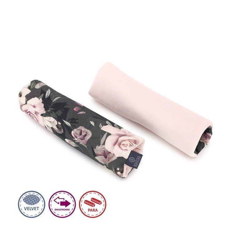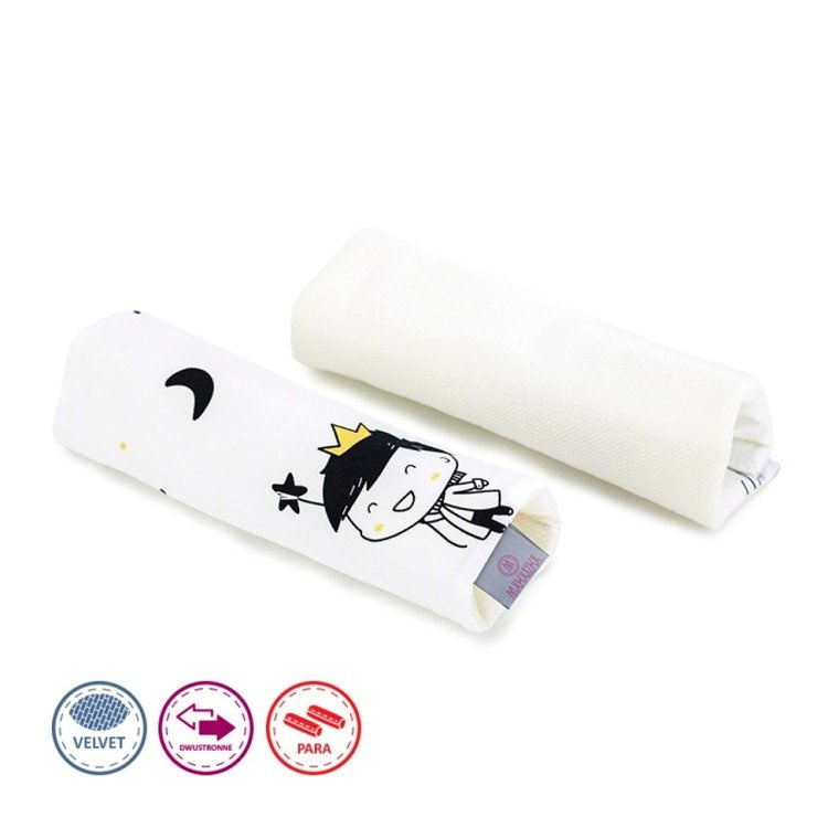 Wykonane z najwyższej jakości bawełny, która nie spiera się, "nie mechaci" i nie traci swoich właściwości nawet po wielokrotnym praniu, druga strona to bajecznie mięciutki Velvet. W środku wypełnione antyalergiczną, lekką, silikonową włókniną zapewniającą miękkość i ochronę przed twardym pasem samochodowym/pasem wózka.