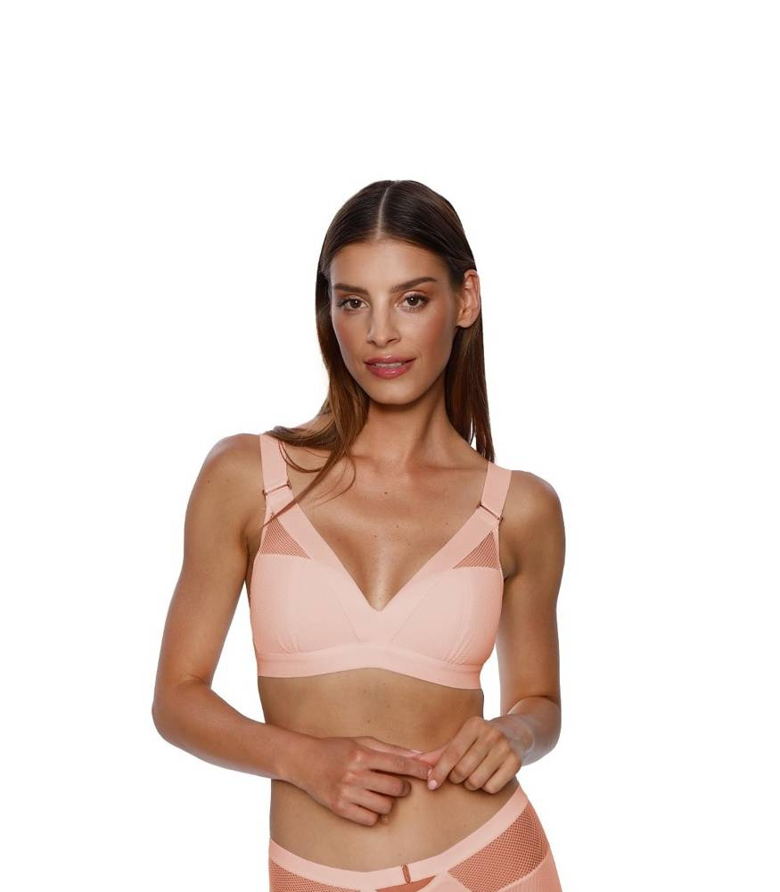 Biustonosz damski zaprojektowany dla kobiet uprawiających sport. Dzięki doskonałej konstrukcji zapewnia stabilne podtrzymanie biustu nawet podczas wytężonego ruchu. Miękkie miseczki wykonane z siateczki, podszyte cieniutką gąbeczką. Dekolt, ramiączka i dół biustonosza z szerokiej, elastycznej gumy