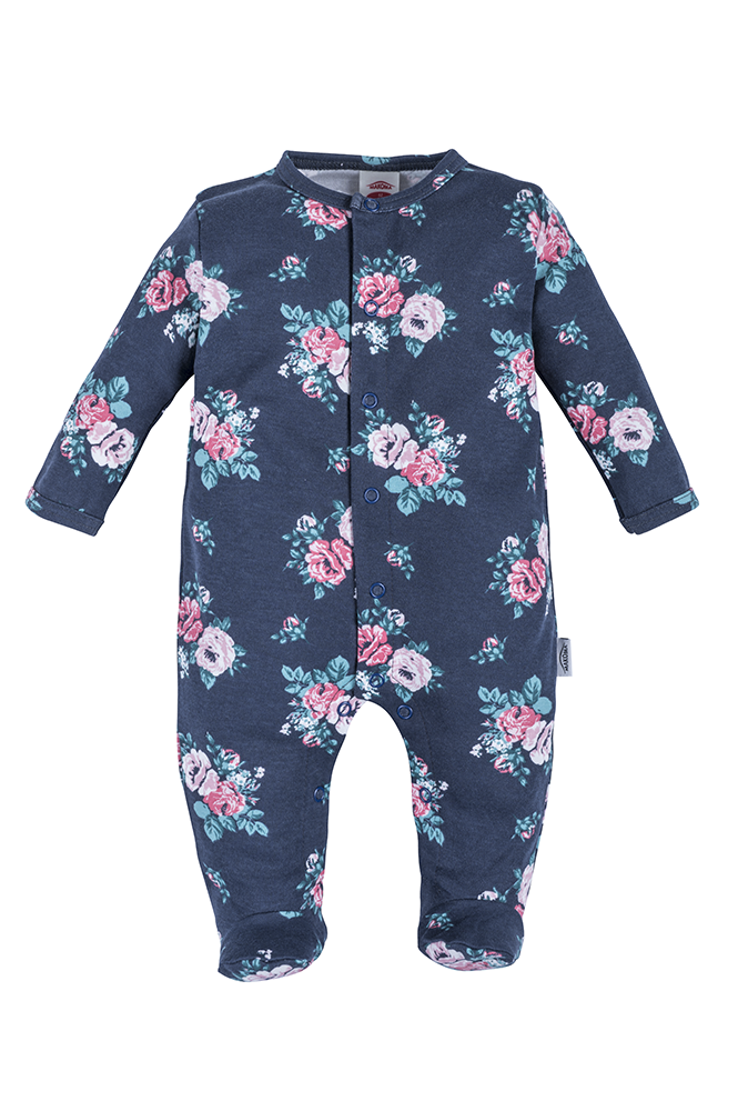 Bawełniany pajac we wzór różyczek. Rozpinany, co umożliwia łatwe i szybkie ubieranie dziecka. Zapewnia swobodę użytkowania i nie krępuje ruchów dziecka. Dostępny w rozmiarach 56-80.