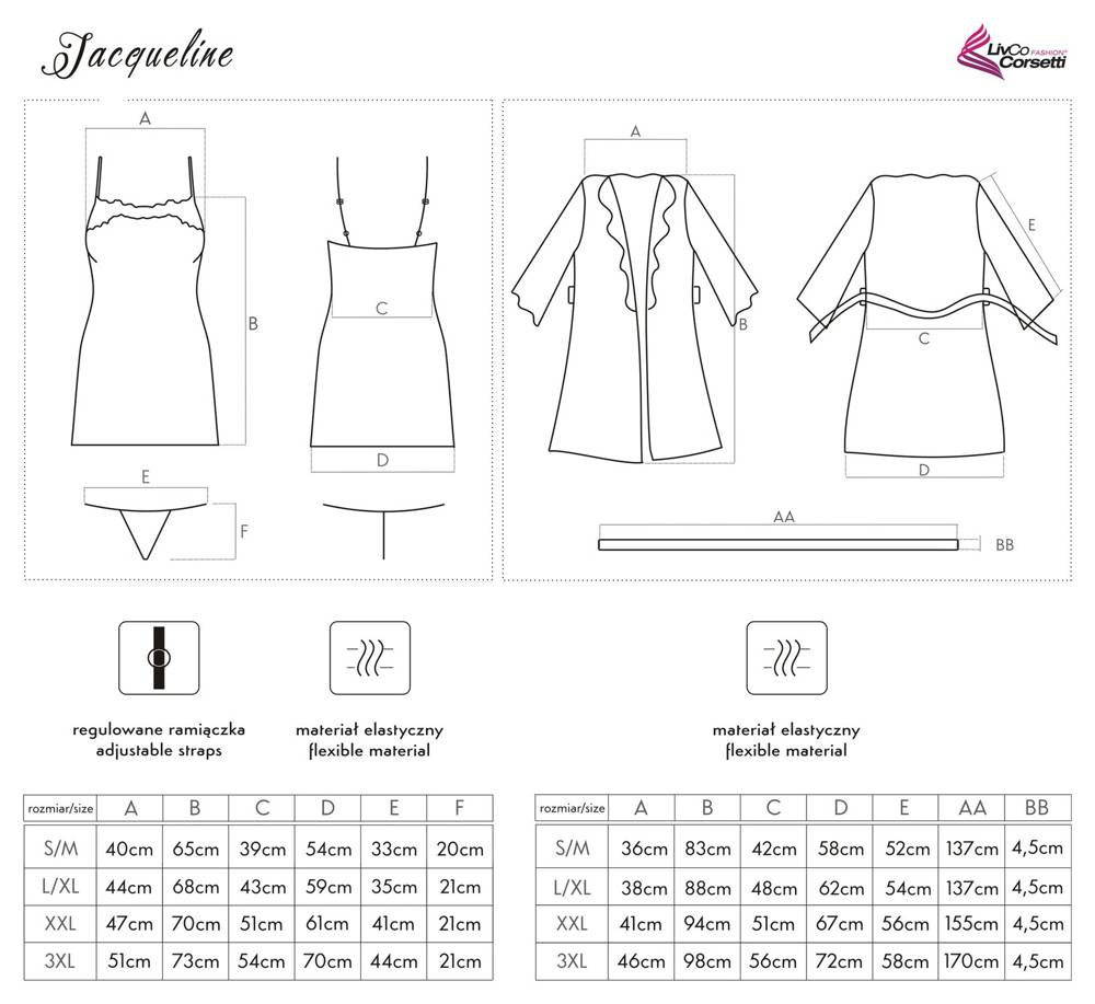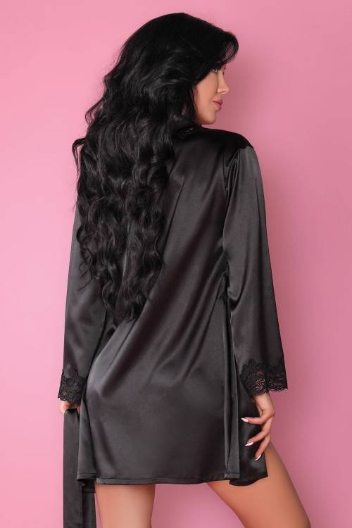 Wyjątkowo piękny komplet bielizny z połyskującej satyny w kolorze czarnym, to szlafrok z koszulką, sięgające do połowy uda. Przód i długie rękawy szlafroka wiązanego w talii paskiem zostały udekorowane śliczną koronką. Koszulka na cienkich, regulowanych ramiączkach, zdobiona przy biuście tą samą koronką. W komplecie stringi.