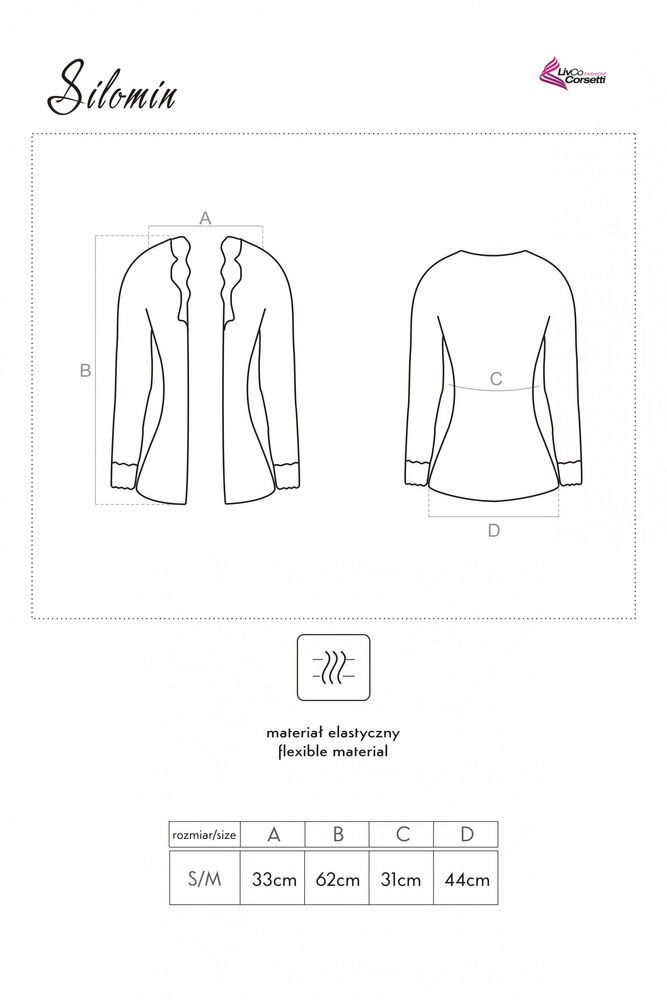 Fascynujący komplet bielizny wykonany z delikatnej koronki w czarnym kolorze. Króciutki szlafrok i body na regulowanych ramiączkach. Góra i długie rękawy szlafroka udekorowane czarną koronką. Biustonosz posiada pionowe rozcięcia. Tył obszyty u dołu koronką, ponętnie odsłania plecy.