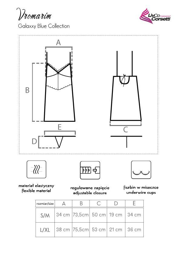 Koszulka wykonana jest z gładkiego, lejącego materiału w kolorze granatowym, delikatnie podkreśla ona kształty kobiecego ciała. Jest wygodna i elastyczna, świetnie układa się na każdej figurze. Pod biustem wszyta jest delikatna koronka w kolorze ecru, która ozdabia także górę koszulki na dekolcie. Jasna koronka kontrastuje ze zdecydowanym granatem reszty materiału, co daje bardzo intrygujący efekt. Pośrodku, pod dekoltem znajduje się mała, satynowa kokardka, która daje całości urocze wykończenie. Koszulka sięga do połowy uda, posiada cienkie, subtelne ramiączka, co sprawia, że wygląda bardzo zmysłowo. Długość ramiączek w zależności od potrzeb można dowolnie regulować i dopasować do swojej sylwetki. Z tyłu, u góry pleców wiązana jest na grubą wstążkę z dominującego, granatowego materiału. W takiej bieliźnie nocnej każda kobieta z pewnością poczuje się pięknie i atrakcyjnie.