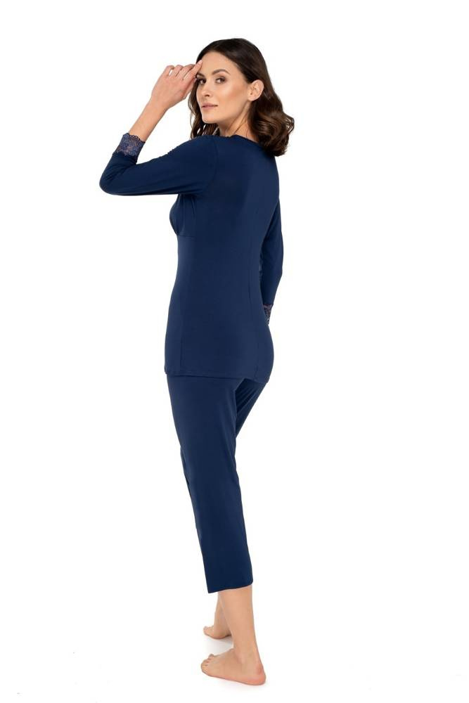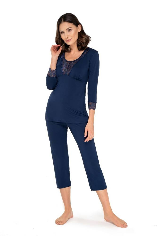 Wygodne i komfortowe piżamy nie muszą być nudne! Ciekawe wzornictwo i kolorystyka są niewątpliwą zaletą. Model wykonany z miłej, gładkiej wiskozy. Koszulka z rękawem 7/8 zakończony efektowną koronką. Do kompletu spodnie typu rybaczki. Pod biustem gumka i delikatne marszczenie.