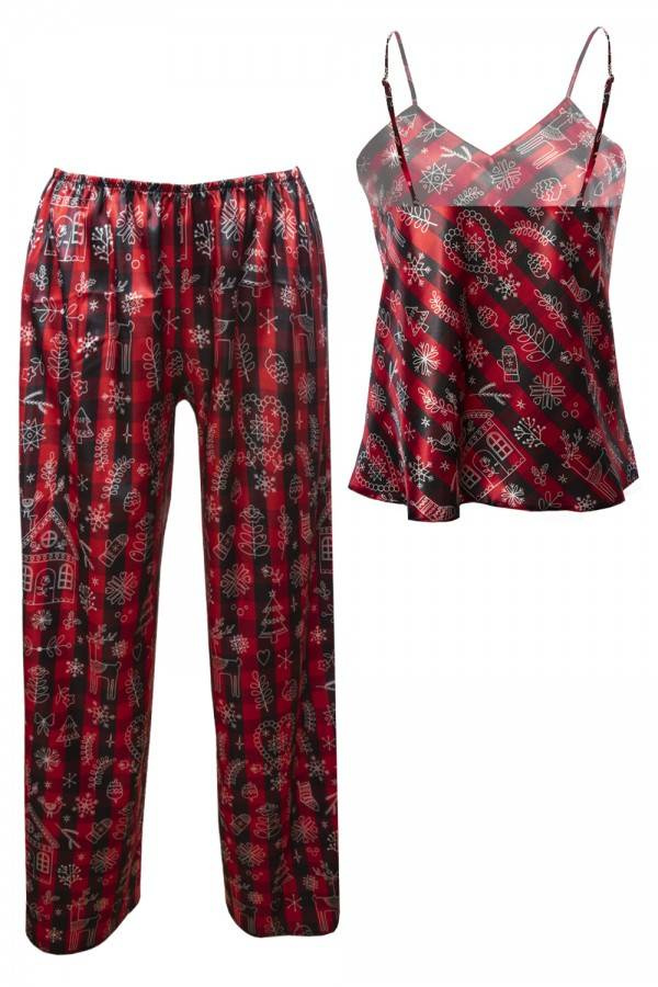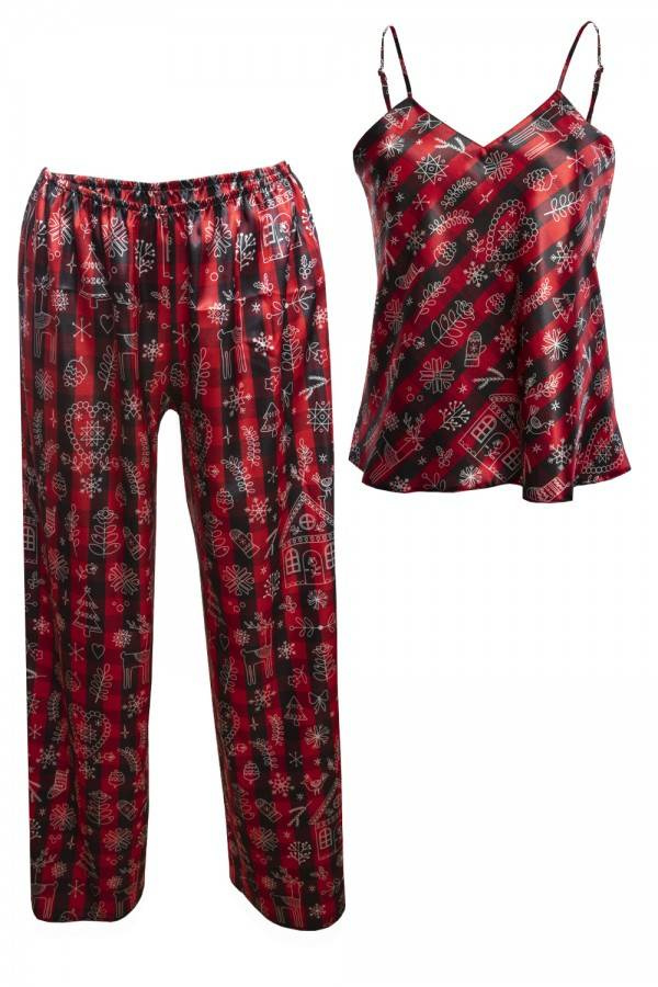 Prosty, zmysłowy dwuczęściowy komplet składający się z koszulki oraz długich spodni. Odważny dekolt w kształcie litery „V”, który jest niezwykle kuszący. Góra koszulki wykonana z drukowanej wzorzystej satyny. Wąskie ramiączka z regulacją zapewnią Tobie poczucie komfortu podczas snu. Spodnie proste, długie satynowe na cienkiej gumce dodające elegancji
