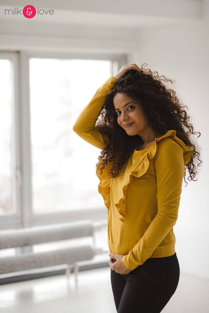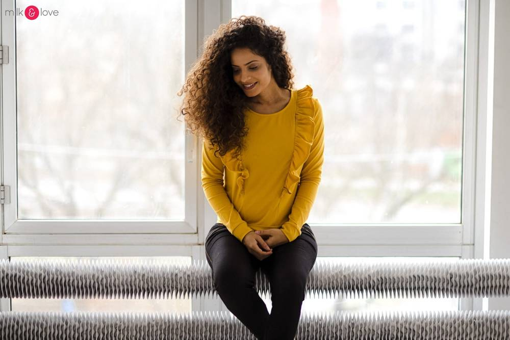 - Luźny krój bluzki, w którym będziesz się swobodnie czuć po porodzie