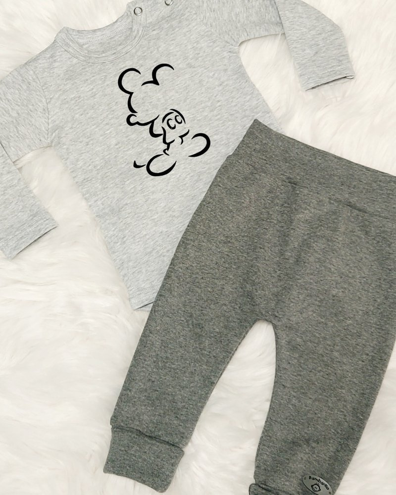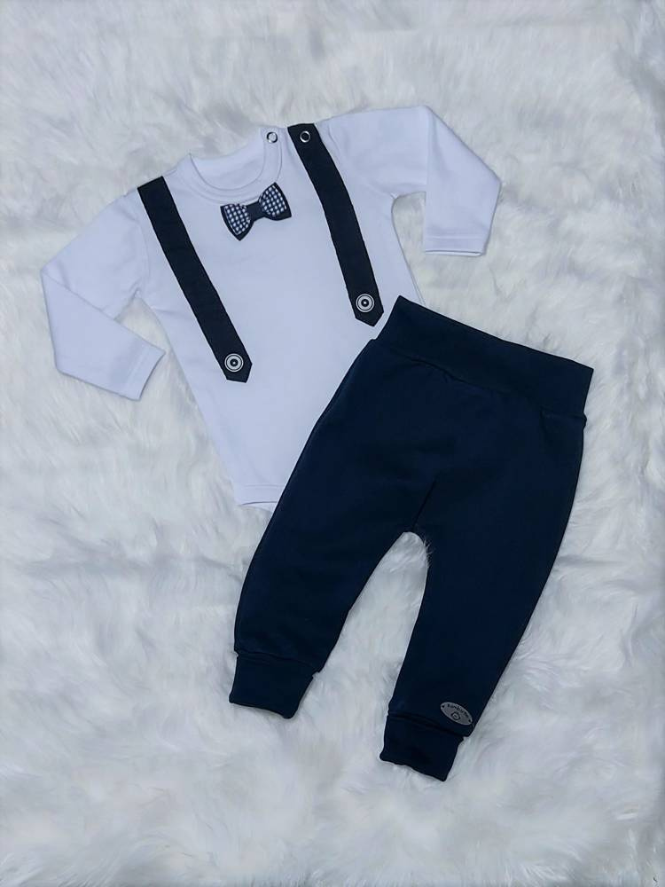 Modne spodnie dresowe wykonane z dresówki. Wszyty w pasie nieuciskający ściągacz z gumką, utrzymuje ubranko w odpowiednim miejscu. Swobodny fason spodni zapewni dziecku wygodę w trakcie nauki chodzenia, raczkowania czy zabawy. Stylizację uzupełniają body "Szelki" z muszką.