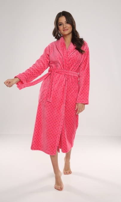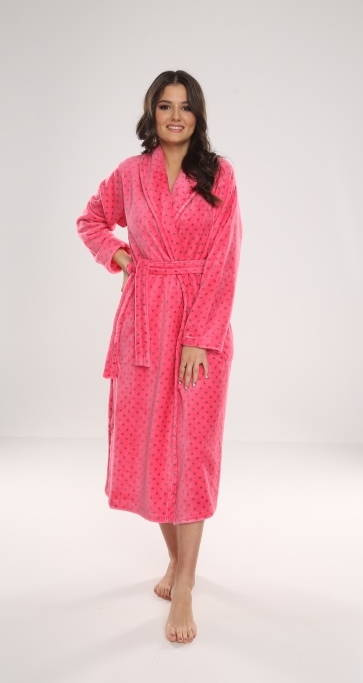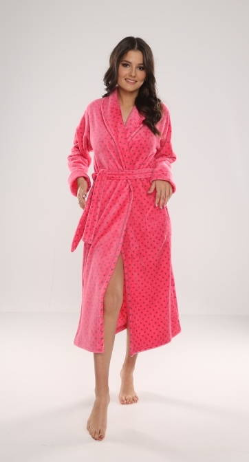 Szlafrok damski firmy FOREX o prostym kroju z kołnierzem. Długość do łydki, po bokach kieszenie, w pasie wiązany na pasek. Całość w groszki. Szlafrok świetnie dopasowuje się do kształtu ciała, jest niezwykle miękki i lekki, wykonany z dzianiny typu soft. Otulenie się nim po kąpieli to sama przyjemność!