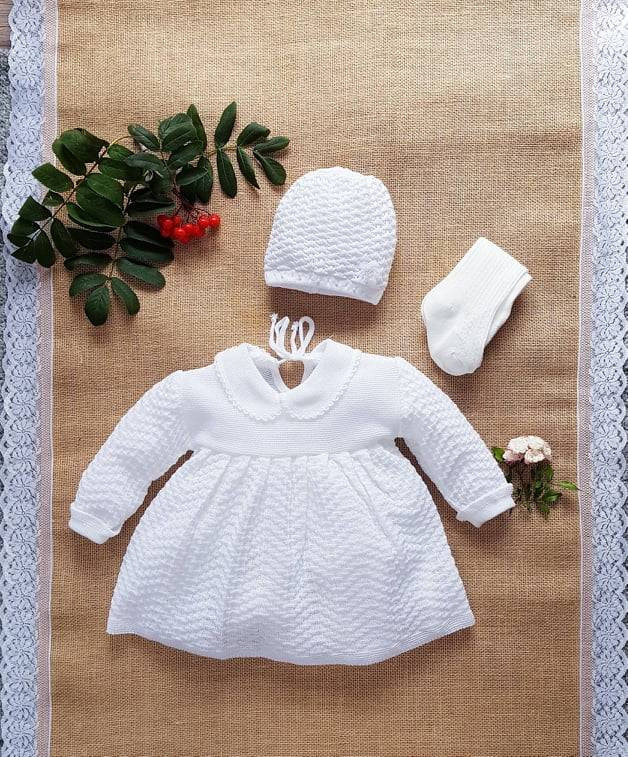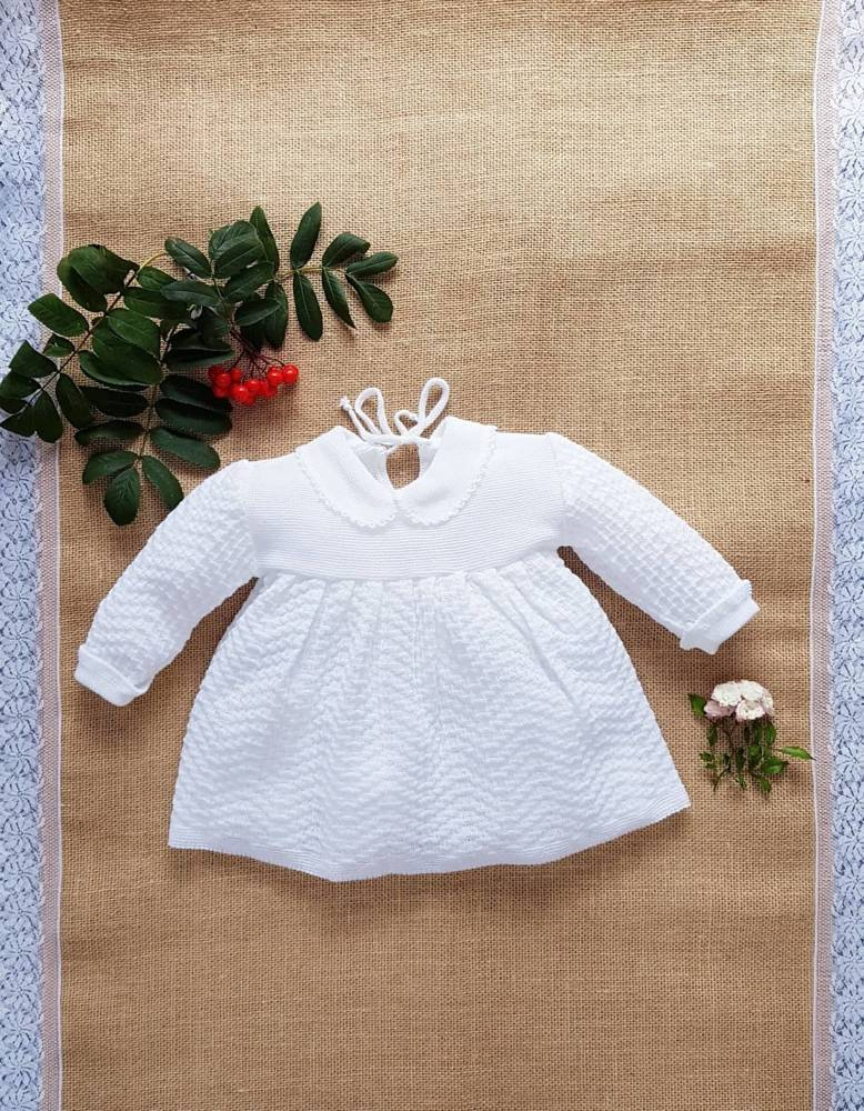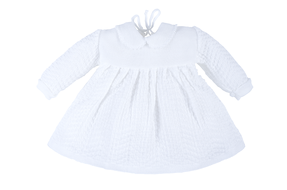 Biała, ażurowa sukienka dla dziewczynki wykonana z bardzo przyjemnej i delikatnej dzianiny. Zapinana z tyłu na sznureczek. Karczek sukieneczki wykonany z gładkiej dzianiny, dół plisowany. Wykończona kołnierzykiem z ozdobnym ściegiem. Rękawki zakończone ozdobnym wywinięciem również z ozdobnym ściegiem. Model ten został stworzony z myślą o wyjątkowych okazjach.