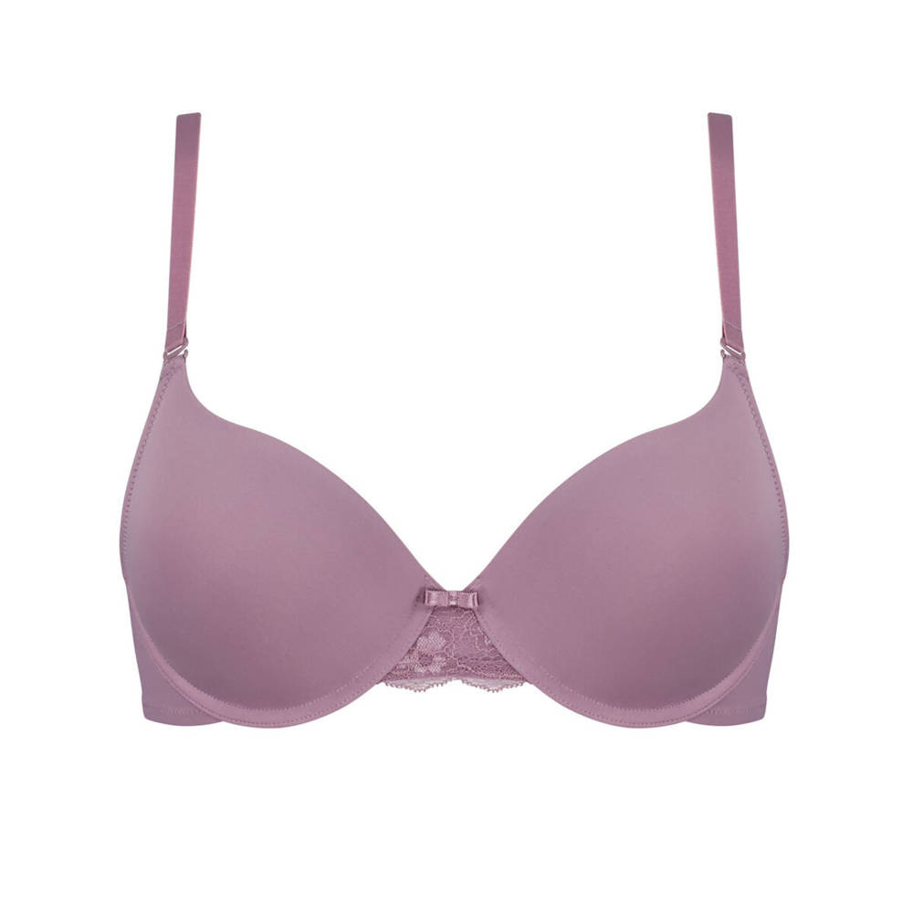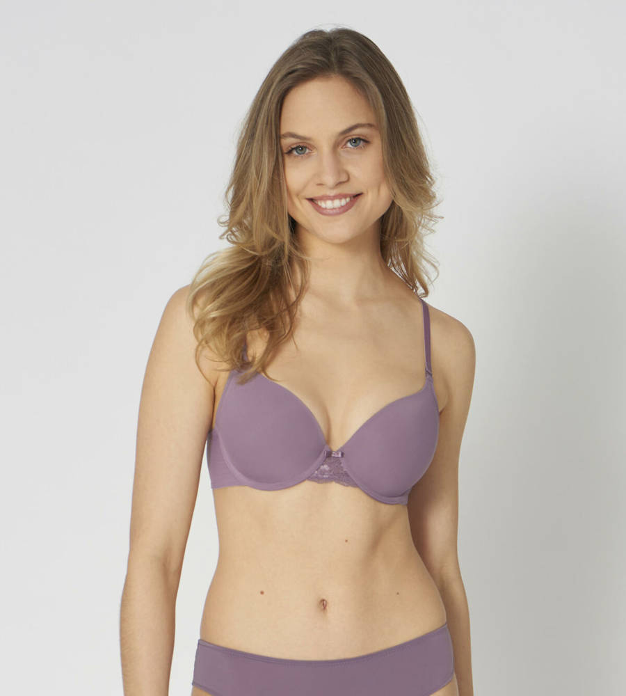 Idealny dla pań o kobiecych kształtach. Miseczki z modelującymi fiszbinami. Formujący szew na miseczkach, naturalnie podkreślający biust. Koronkowa lamówka po bokach miseczek. Regulowane ramiączka z koronkowym obszyciem z przodu.