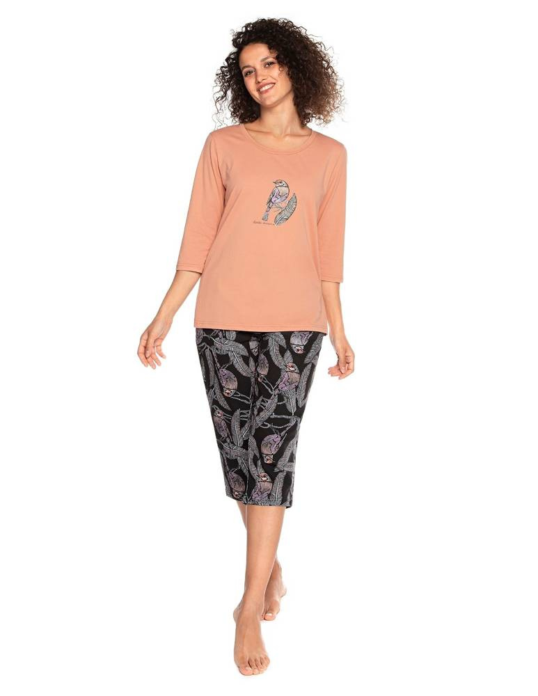 Dwuczęściowa piżama damska wykonana z wysokiej jakości bawełny. Koszulka z rękawem 3/4, z przodu ozdobiona delikatnym wzorem.