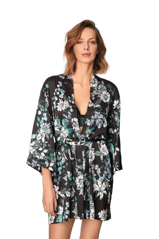 Satynowy zwiewny peniuar damski z kwiatowym motywem, z rękawem 7/8, wiązany w pasie.