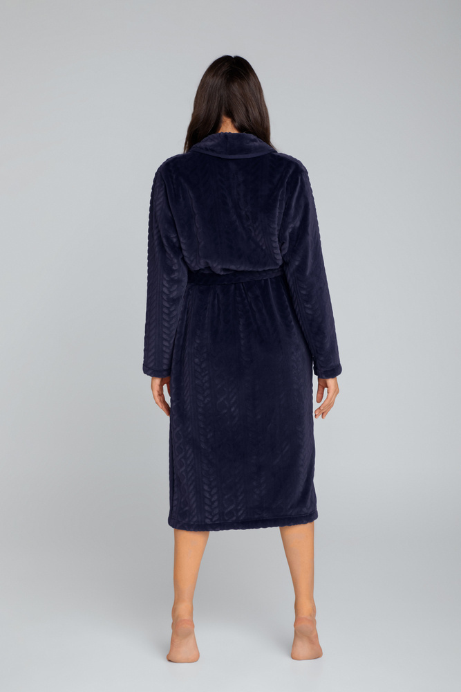 Stylowy szlafrok damski Bona to nasza propozycja na chłodne wieczory i poranki. Cudownie miękki i niezwykle ciepły, zapewni Ci komfort i wyjątkowy relaks. Klasyczny krój wykończony szalowym kołnierzem oraz praktycznymi kieszeniami. Wiązanie w pasie pięknie podkreśli sylwetkę. Model wykonany z dzianiny bi polar w bardzo ciekawy i oryginalny wzór warkocza 3D.