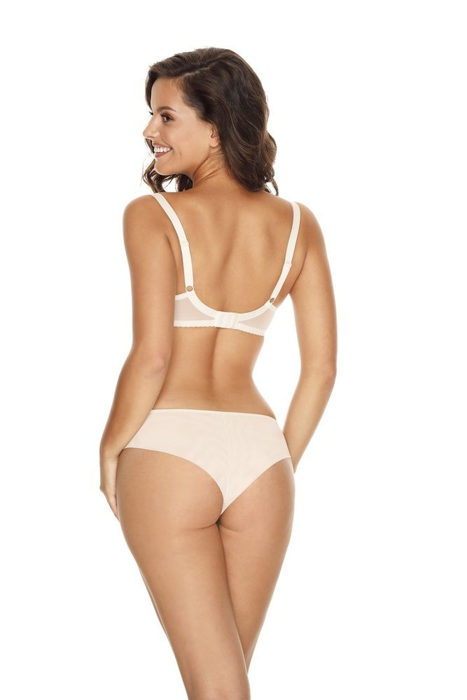 Zmysłowy biustonosz soft z fiszbinami wykonany z transparentnej siateczki z efektownym haftem. Obwód ze sprężystej, odpornej na rozciąganie dzianiny typu lycra z pionowa fiszbiną. Posiada nieodpinane, regulowane ramiączka - ich szerokość uzależniona od wielkości rozmiaru.