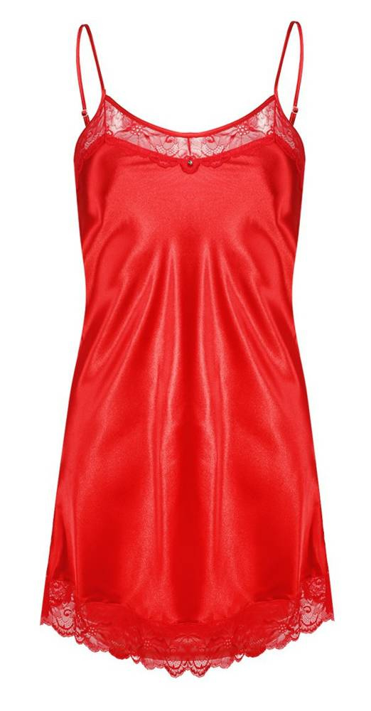 Efektowna koszulka damska z delikatnej i przyjemnej dla ciała satyny na cienkich ramiączkach. Z pozoru prosta, lecz tak naprawdę jest bardzo wyrafinowaną bielizną. Dół koszulki oraz dekolt ozdobione są elegancką koronką. Na łączeniu miseczek znajduje się połyskujący element biżuteryjny. Skład: 100% poliester.