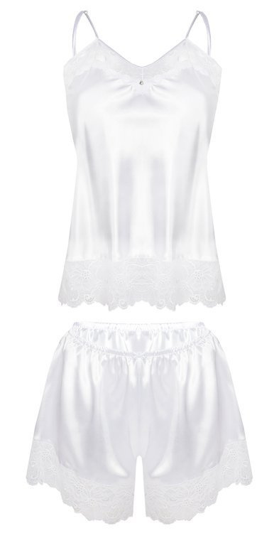 Satynowy niezwykle seksowny komplet Brenda firmy DKaren. Koszulka i spodenki ozdobione śliczną delikatną koronką. Koronka pod kolor satyny. Komplet wykonany z najwyższej jakości szlachetnej satyny.