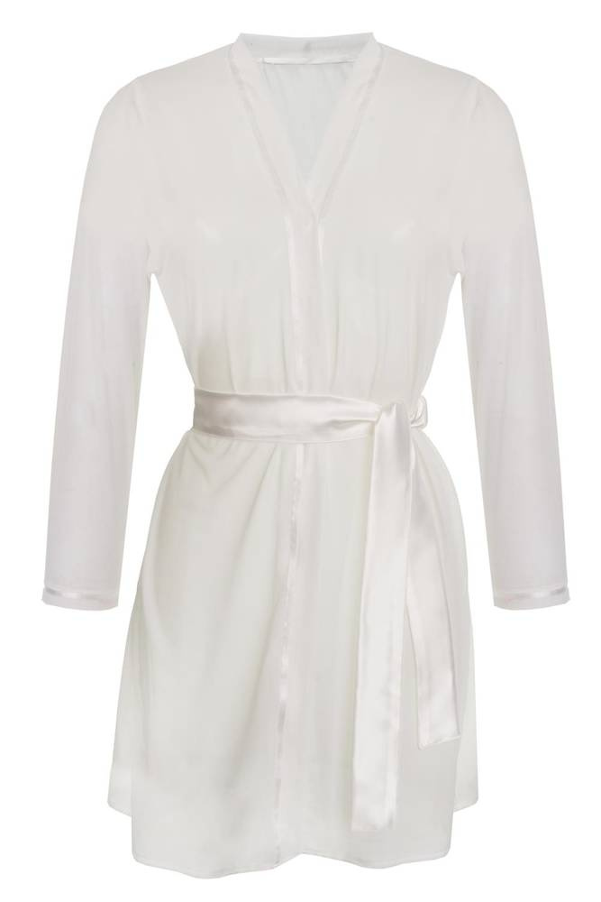 Podomka Aisha to z pewnością propozycja dla nieco odważniejszych pań, które nie boją pokazać się czegoś więcej. Tutaj nie trzeba dodawać, że widząc Cię w tej podomce, Twój partner będzie w siódmym niebie. Podomka Aisha wykonana jest z niemal przezroczystego tiulu. Szlafroczek obszyty jest tasiemką. Jego rękawy są długie i luźne. Do podomki dołączony jest satynowy pasek, dzięki któremu można wyeksponować swoje atuty i podkreślić talię. Podomka Aisha dostępna jest w trzech różnych kolorach. Na który się skusisz? Seksowną czerwień, tajemniczą czerń czy delikatną ecru? Wybierz swój ulubiony kolor i spędź upojne chwile ze swoim mężczyzną..