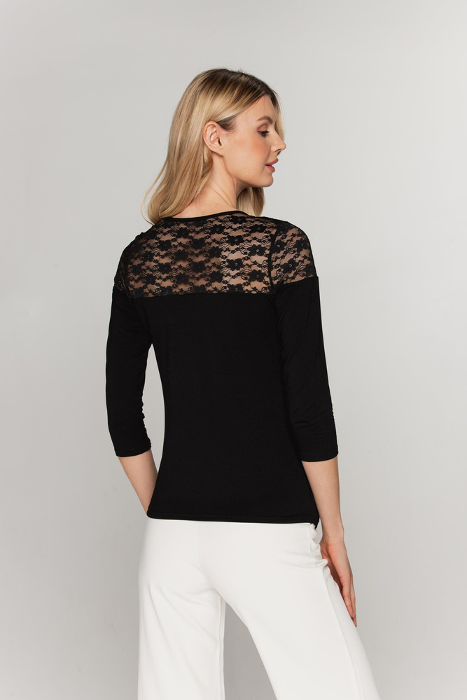 Bluzka w kolorze klasycznej czerni z długim rękawkiem. Wykonana z wysokiej jakości wiskozy 94% i dodatku elastanu 6%. Dekolt półokrągły, obszyty lamówką. Dekolt i tył z delikatnej koronki o kwiatowym motywie. Idealna pod żakiet oraz na wieczorowe wyjście. Powyższy produkt jest wyrobem najwyższej jakości, został zaprojektowany według najnowszych trendów mody.
