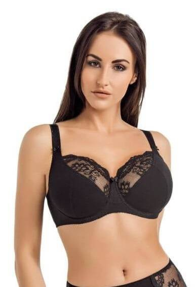 Biustonosz miękki w kolorze czarnym z fiszbinami. Wykonany jest z wysokiej jakości bawełny oraz lycry, która doskonale dopasowuje się do sylwetki. Górę miseczek zdobi delikatna kwiatowa koronka, przyjemna w dotyku i dla kobiecego ciała. Biustonosz posiada cięcia: pionowe i poziome, które unoszą piersi, jednocześnie je modelując. Głębokie miski zakrywają całe piersi, ale ich nie przecinają. Biustonosz jest wyżej zabudowany z boku, co powoduje że mankamenty kobiecej sylwetki zostają zakryte. Ramiączka są regulowane, a ich szerokość zależy od rozmiaru. Posiadają ozdobną kokardę. Biustonosz z fiszbinami jest bardzo wygodny i nadaje się do codziennego użytku.