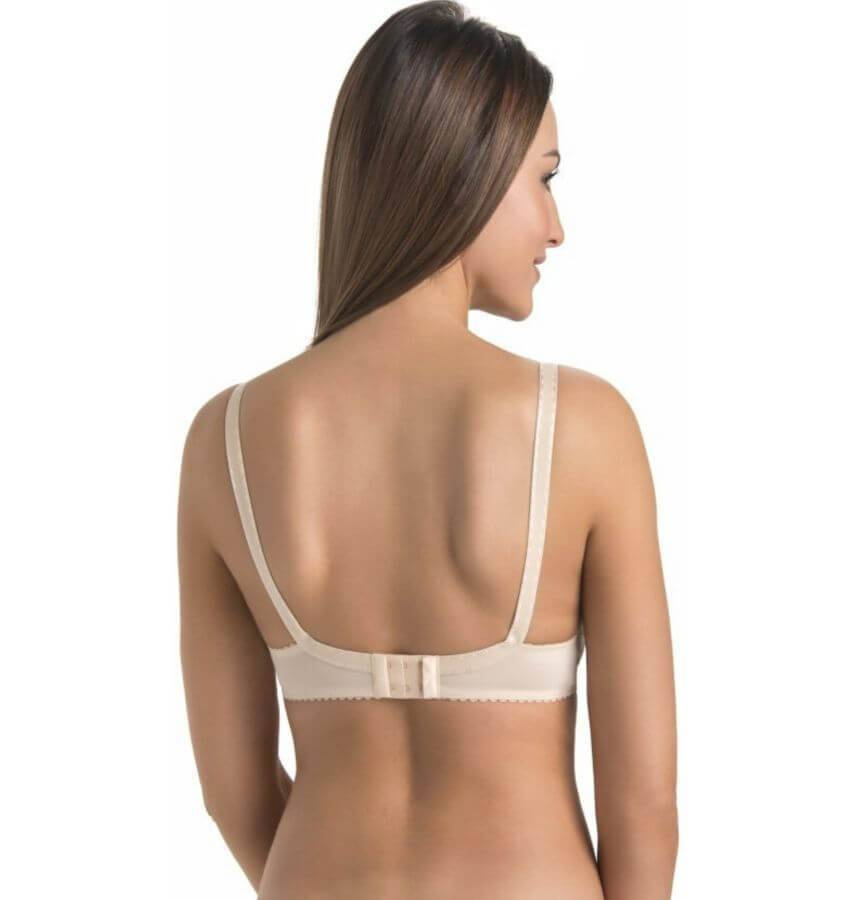 Bez fiszbinowy, miękki biustonosz w kolorze beżowym. Biustonosz jest przeznaczony dla kobiet ceniących sobie komfort i wygodę. Miseczki są pełne i dają maksimum stabilności podczas użytkowania. Biustonosz dzięki pionowemu cięciu podnosi piersi do góry i ładnie je modeluje, a boczny panel spycha piersi do środka. Koronka z motywem różanym znajdująca się w górnej części misek, jest lekko elastyczna i w związku z tym dobrze dopasowuje się do biustu, nie tnie piersi. Bardzo wygodna regulacja ramiączek od przodu zwłaszcza dla Pań, które mają utrudnienia sięgać do pleców. Miski podszyte są stabilną, ekologiczną bawełną, która powoduje, że skóra oddycha i nie poci się. Dołem od wewnątrz biustonosza wszyta jest elastyczna, szeroka gumka, która dodatkowo podtrzymuje biust. Biustonosz bez fiszbinów występuje także w kolorze białym oraz czarnym.